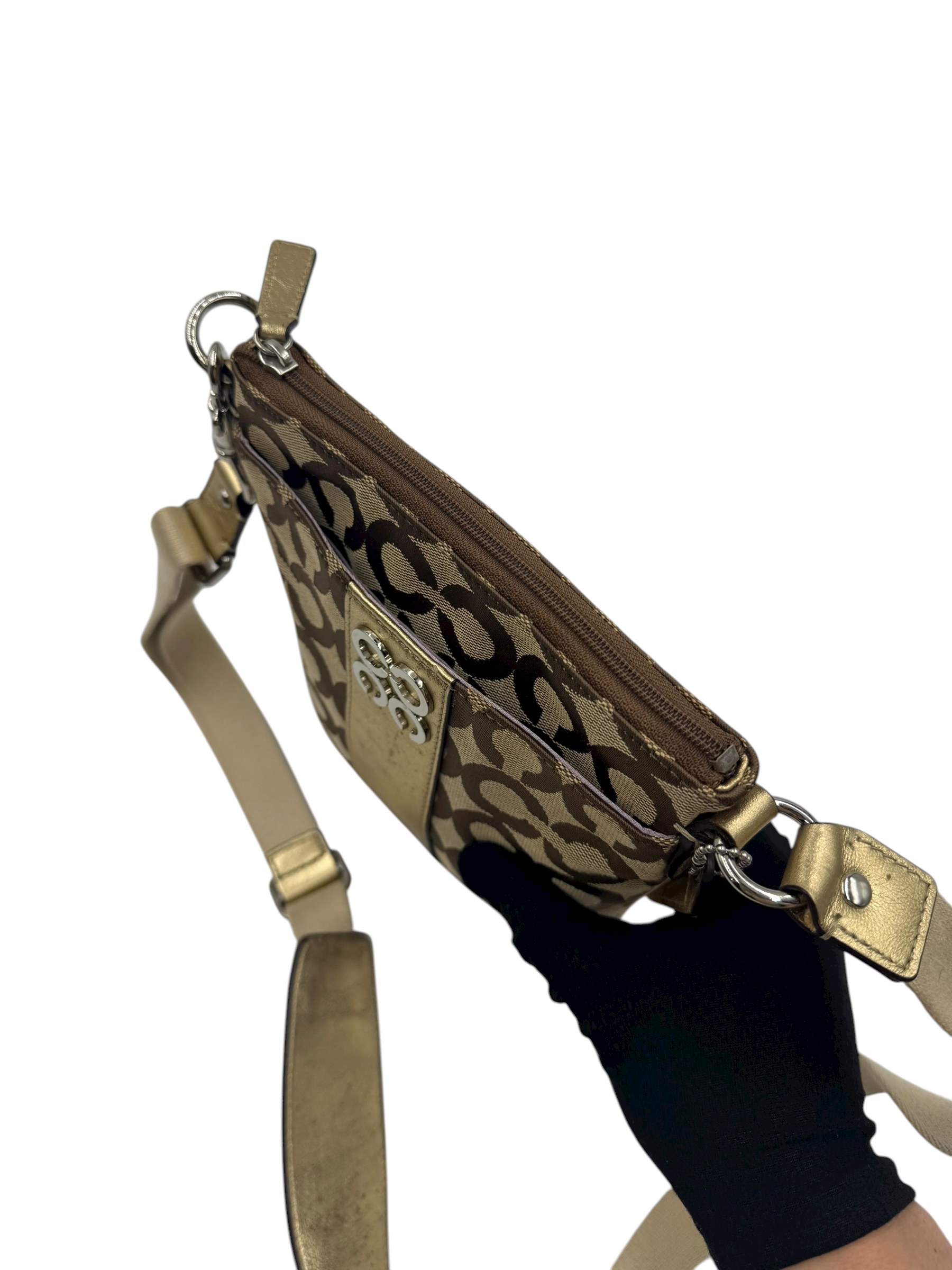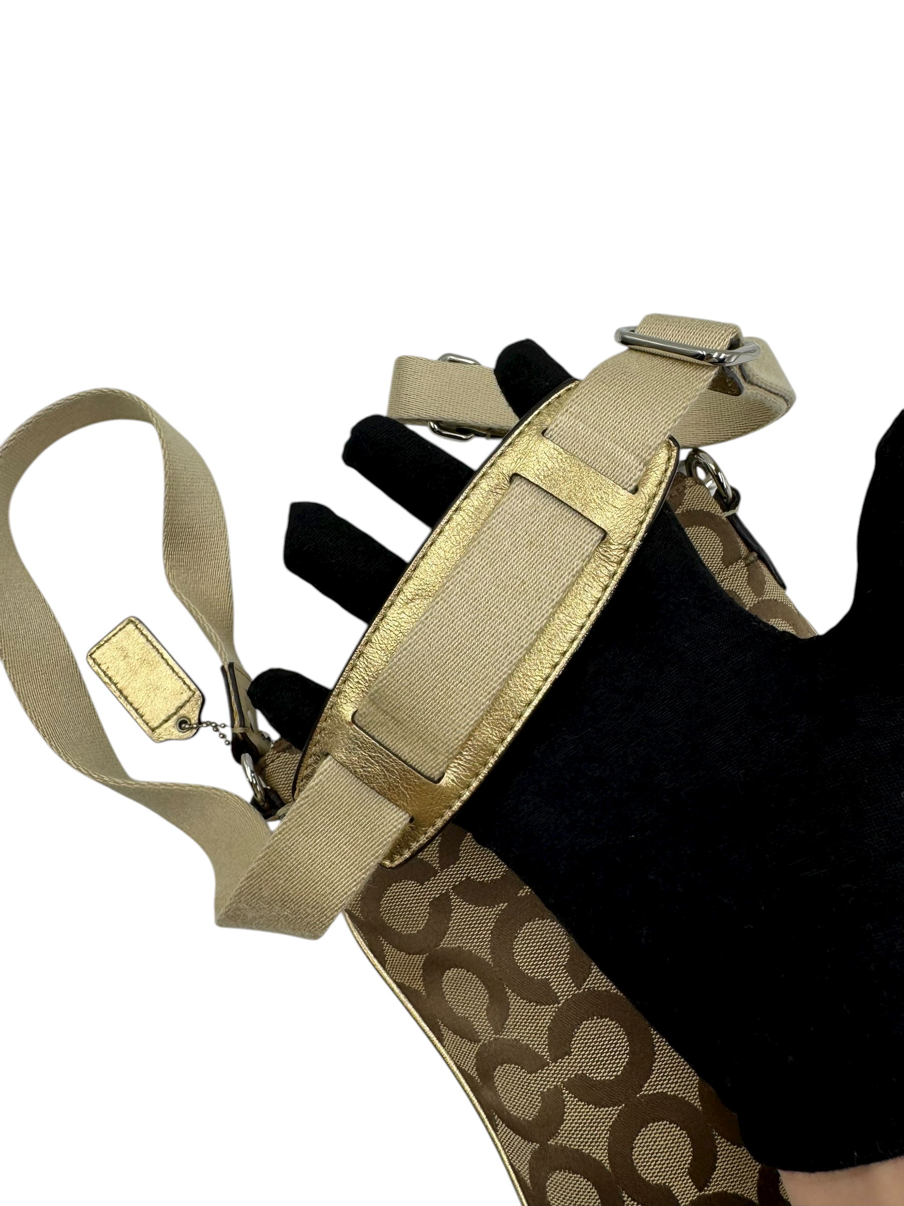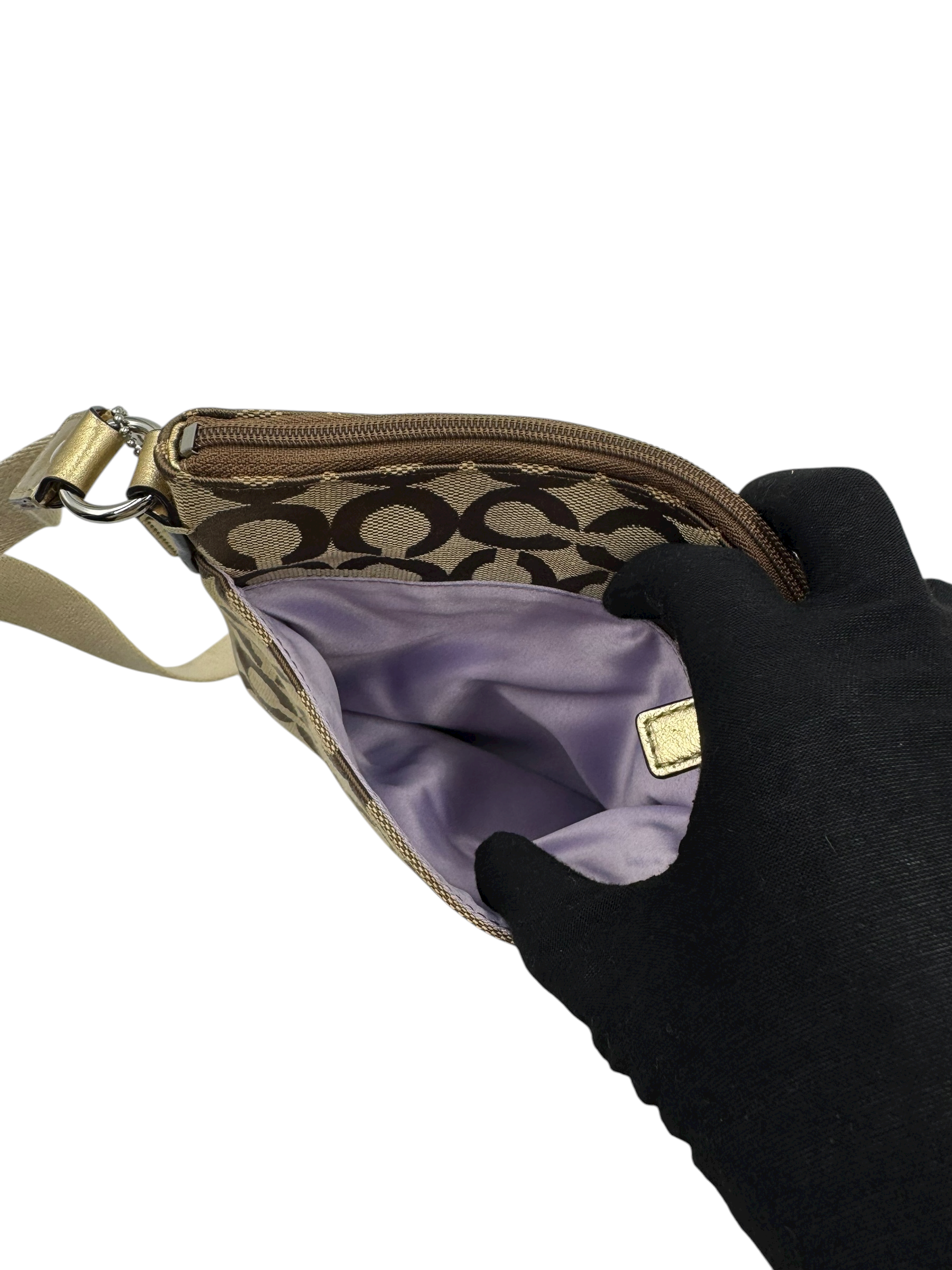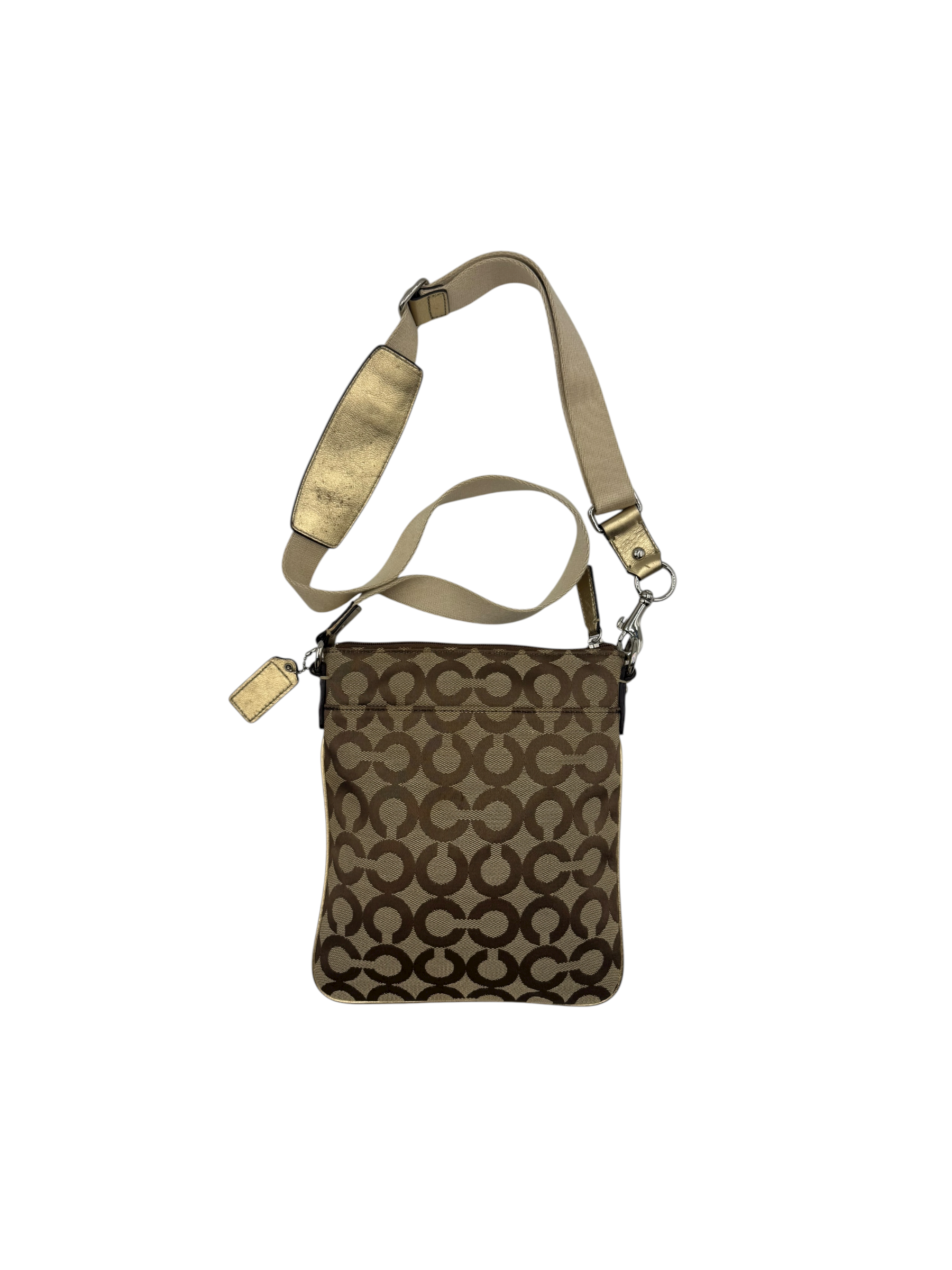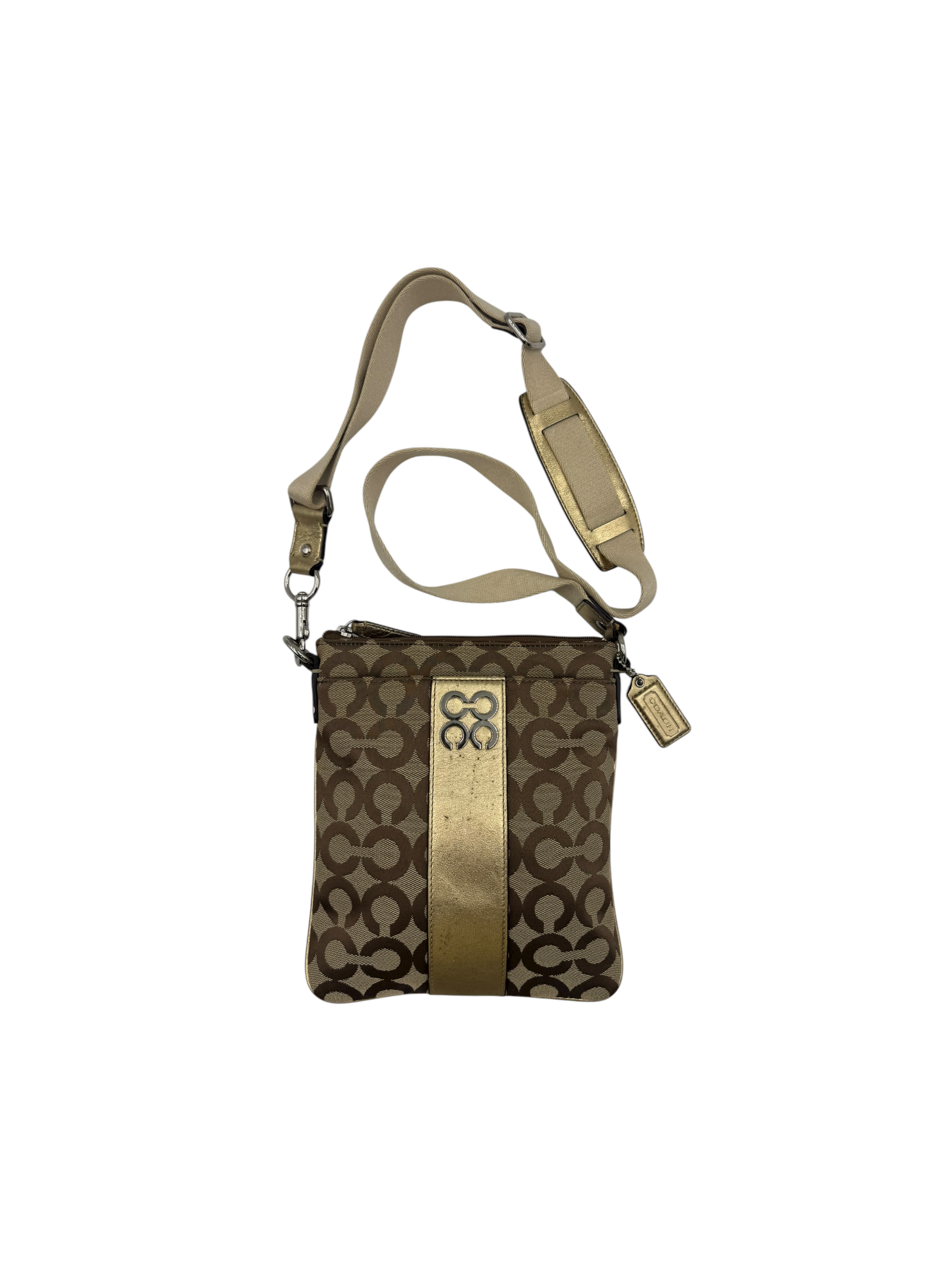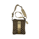 Crafted in Coach’s signature jacquard canvas with a metallic gold stripe accent and logo plaque. Features an adjustable fabric crossbody strap, top zip closure, and fabric lining. A lightweight and practical everyday companion with a chic metallic finish.