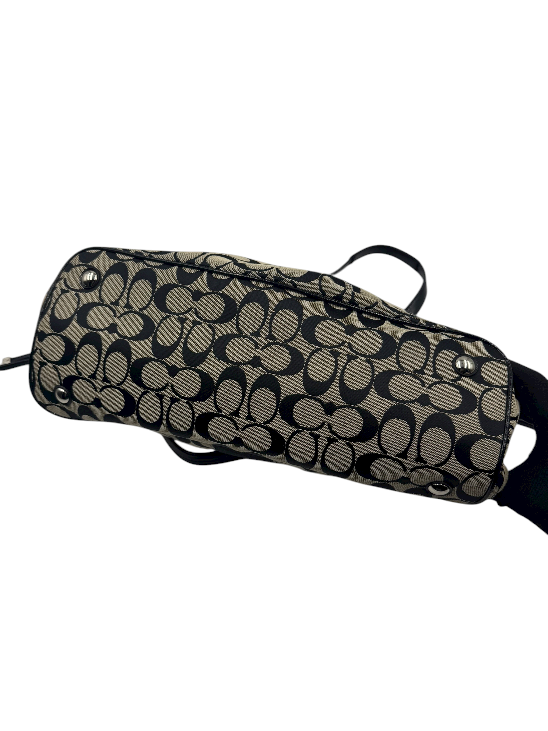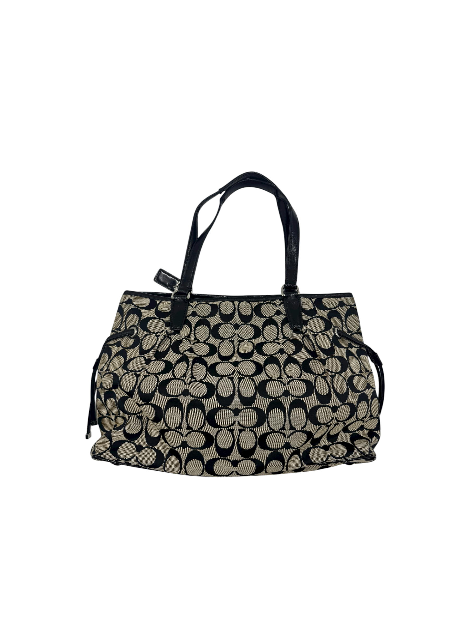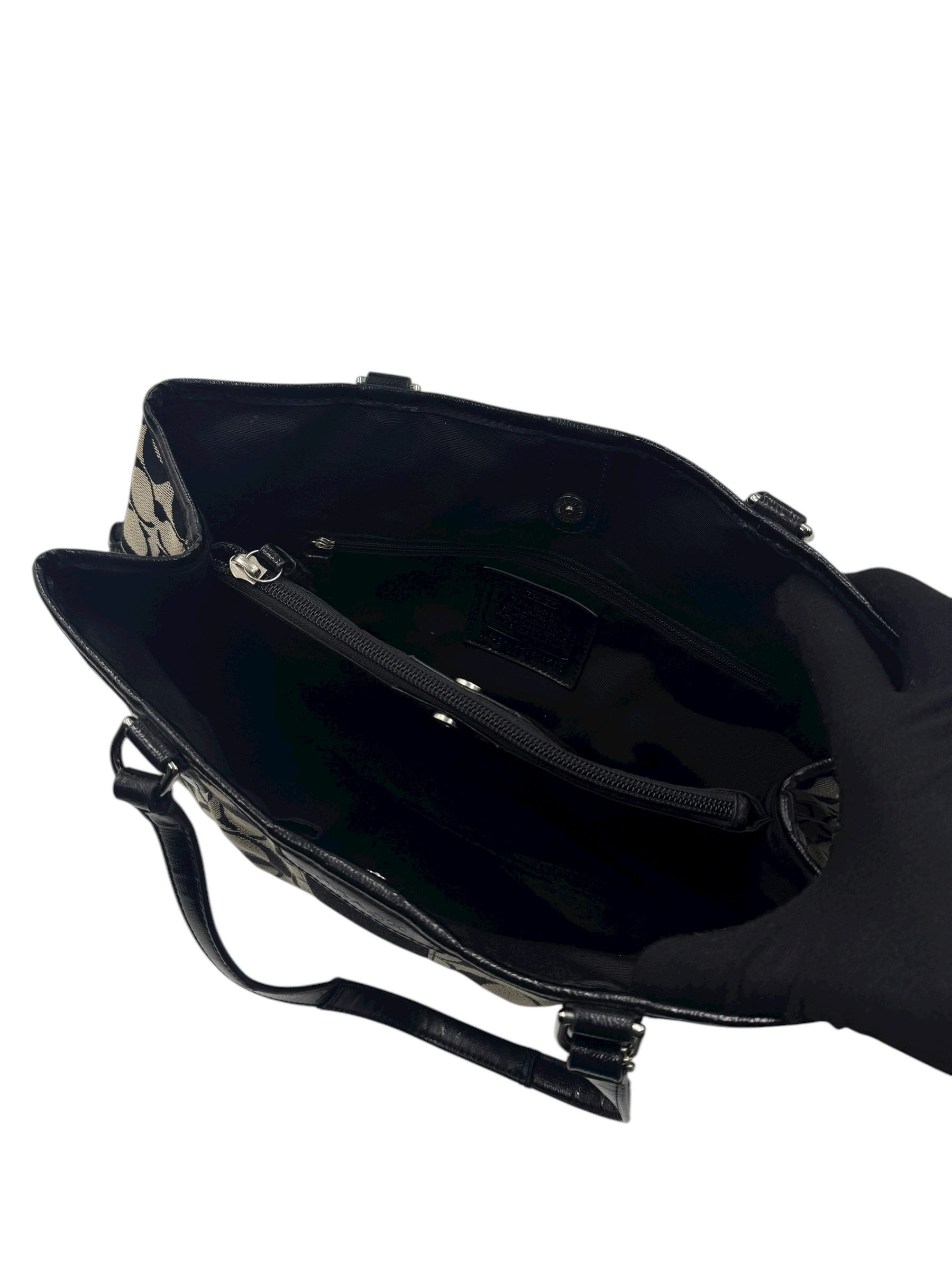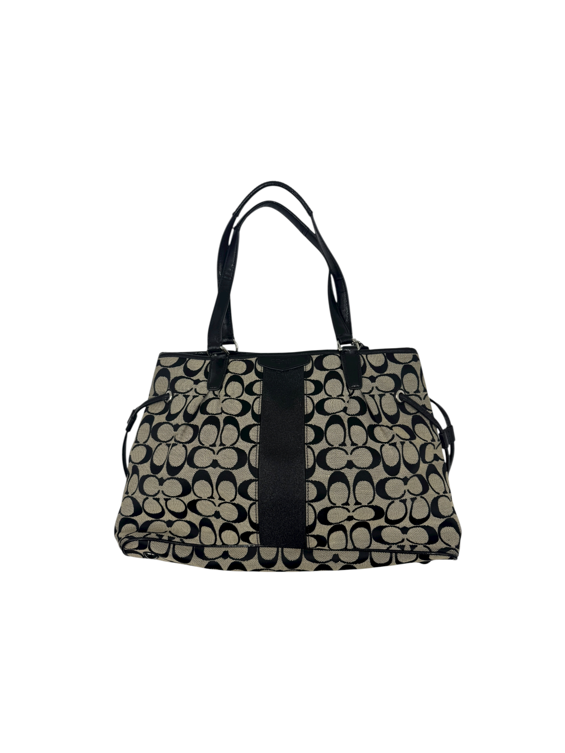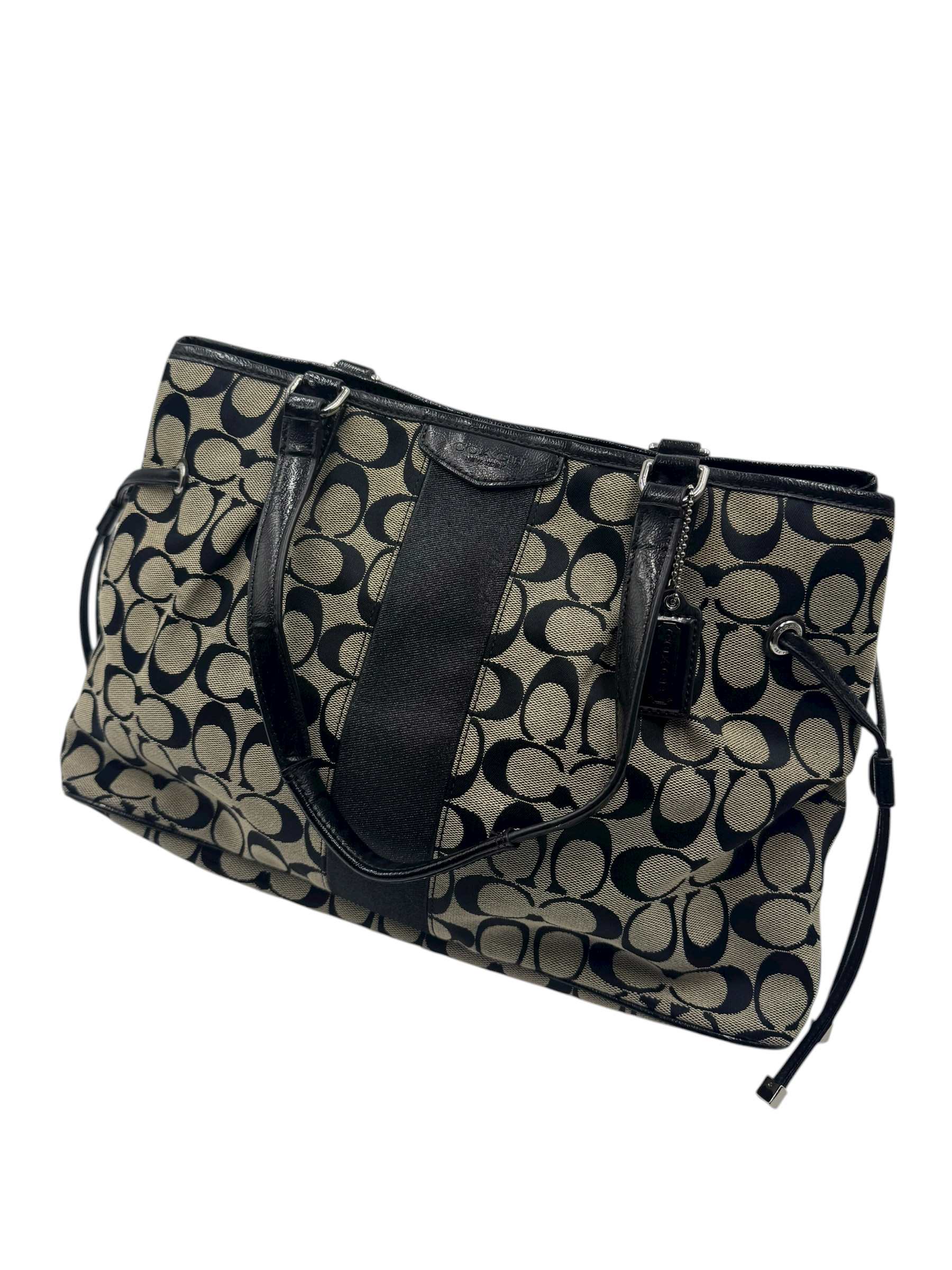 Classic Coach tote in black signature jacquard with matching black leather handles and trim.