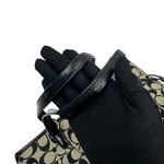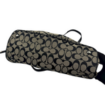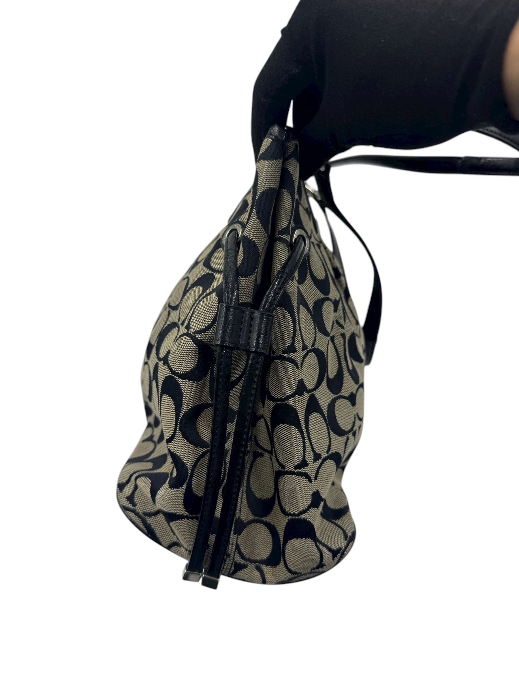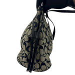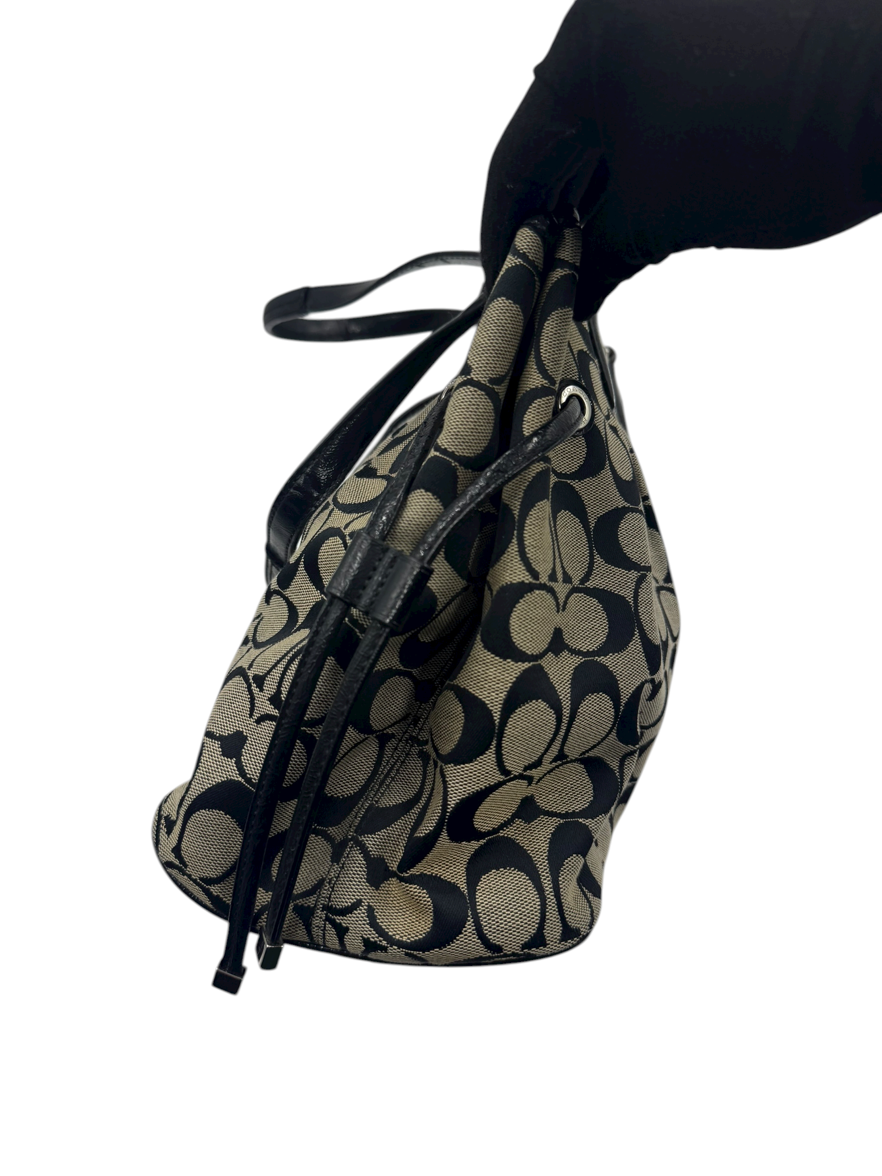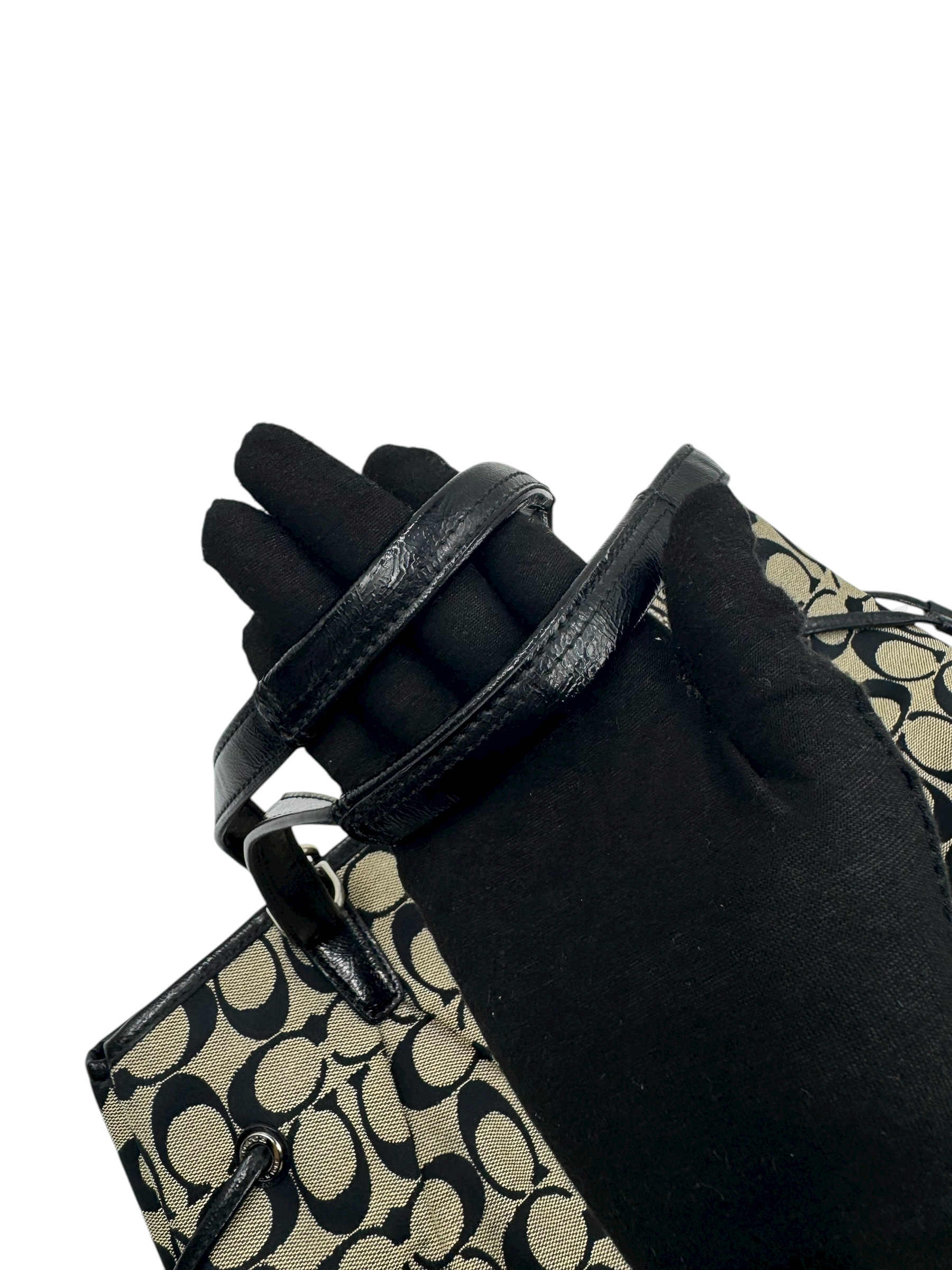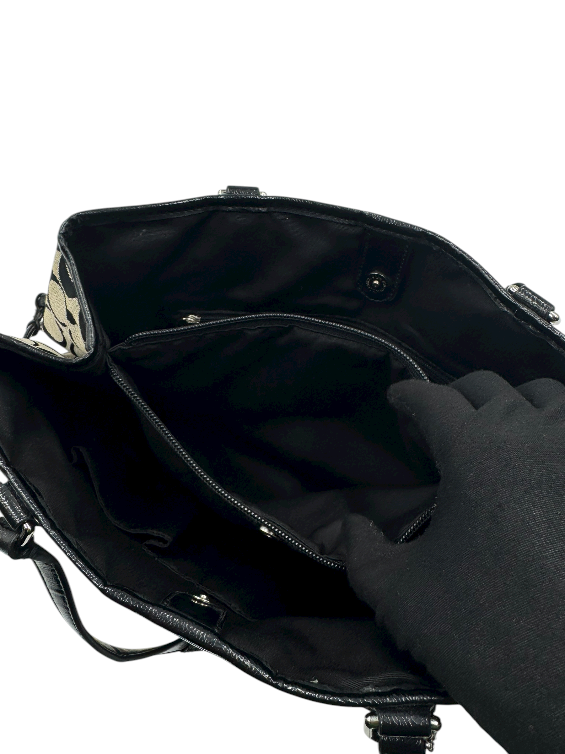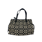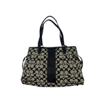 Classic Coach tote in black signature jacquard with matching black leather handles and trim.