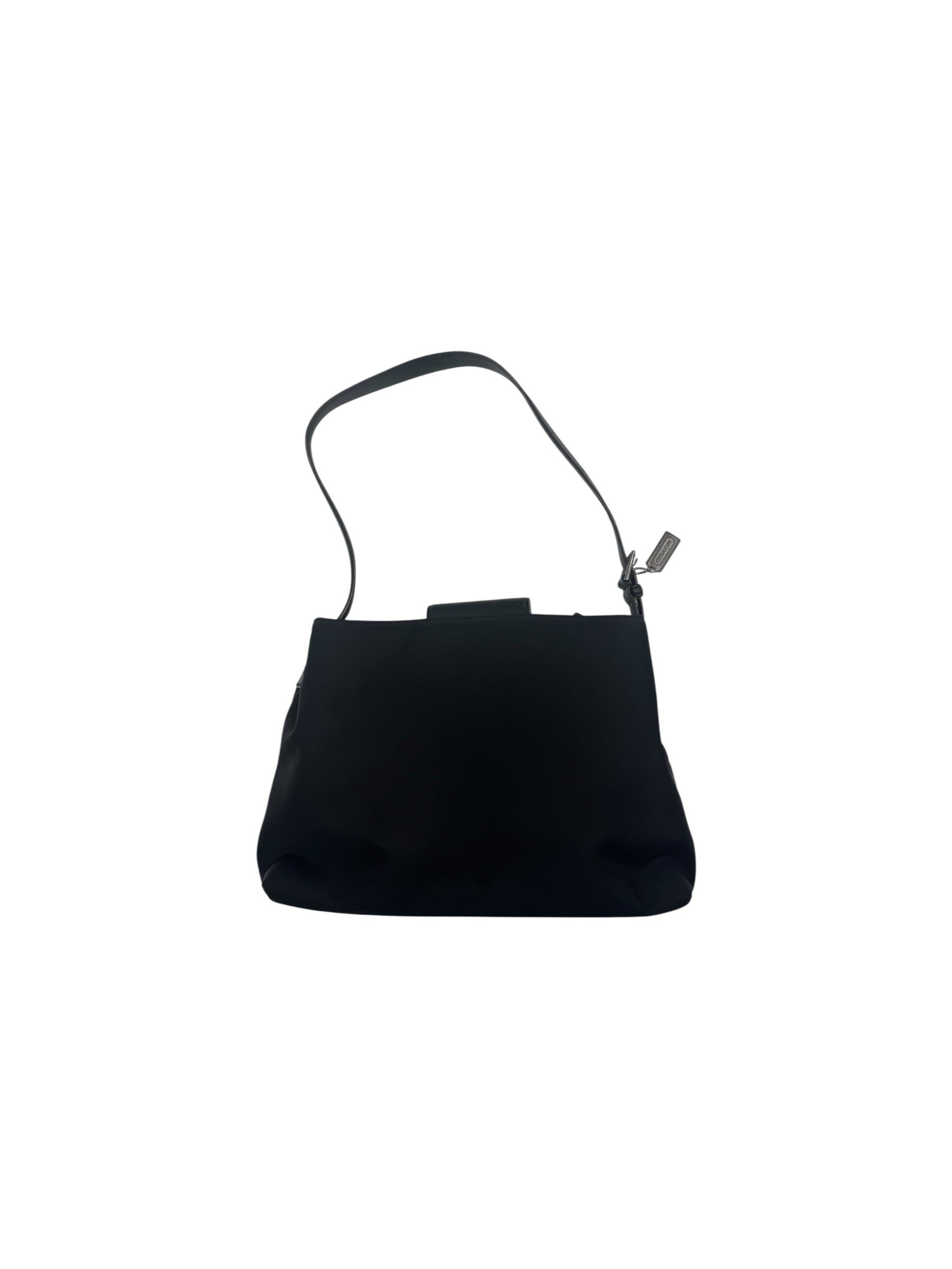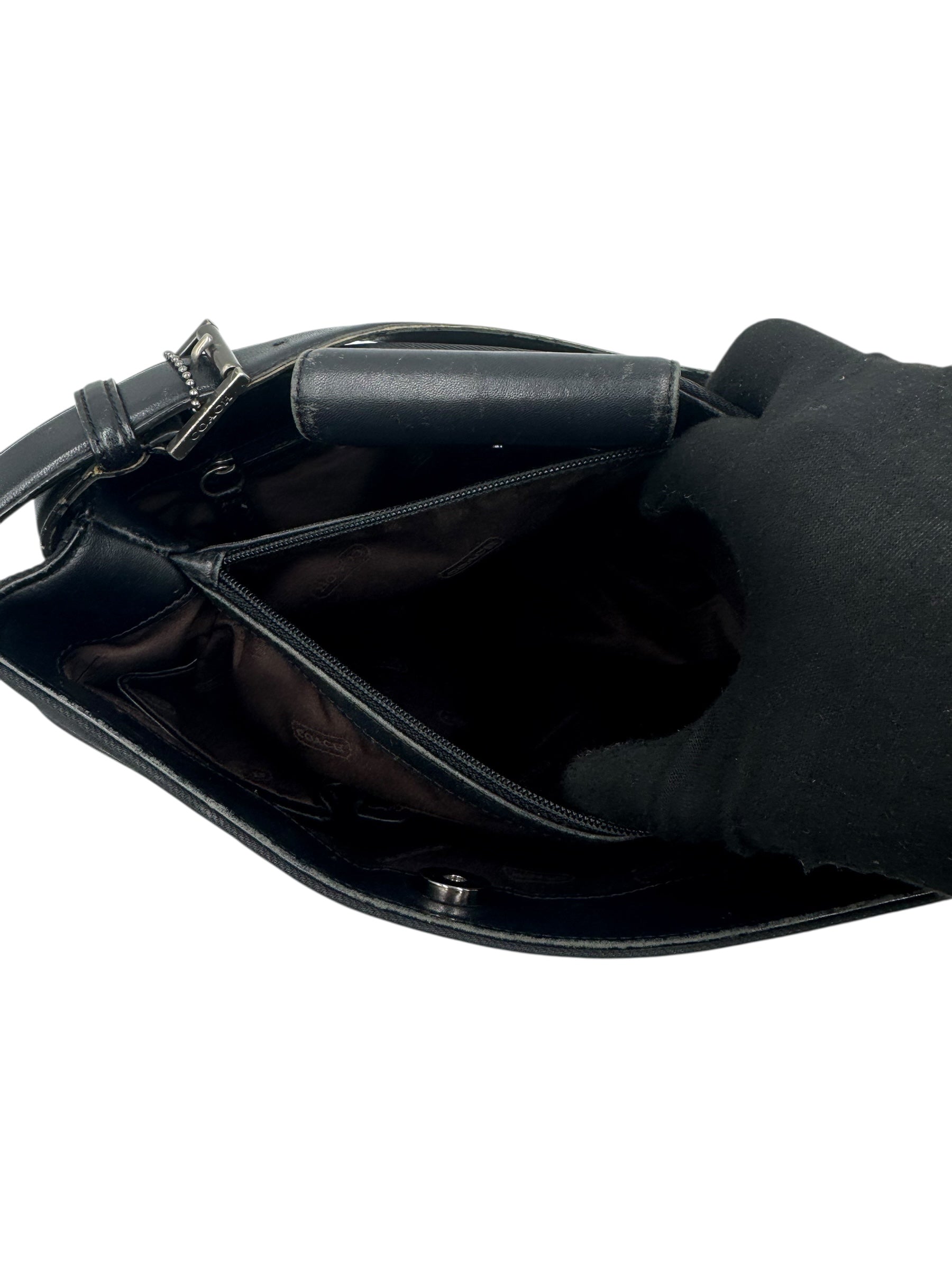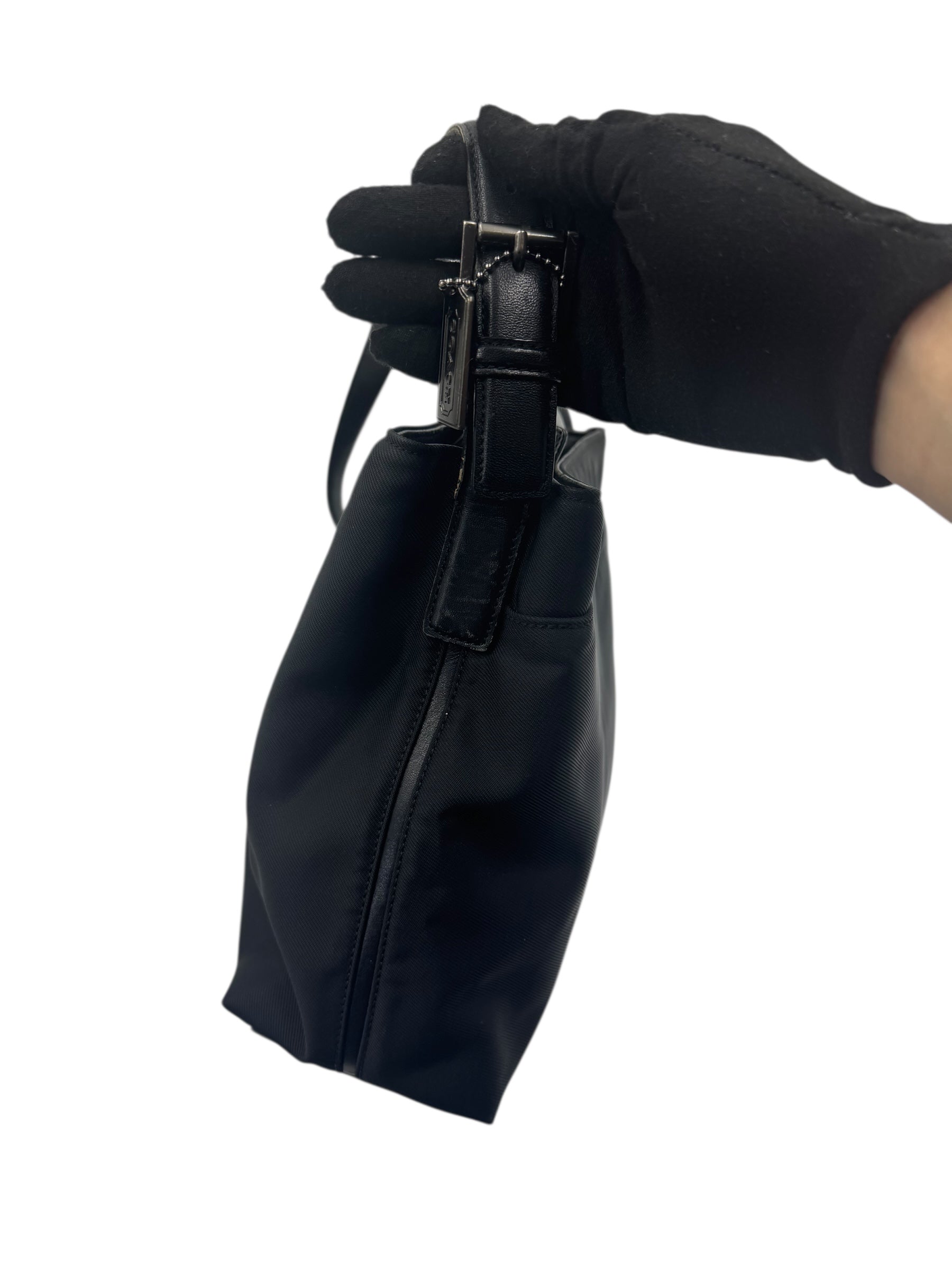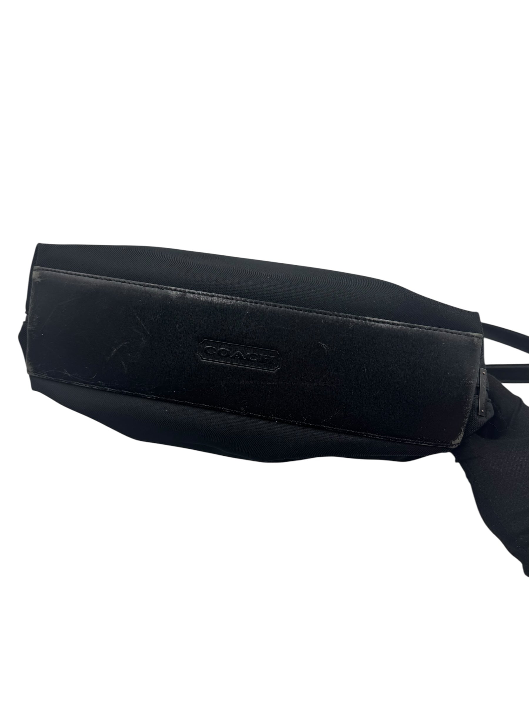 Classic black Coach shoulder bag featuring durable nylon material, leather strap, and top magnetic closure.