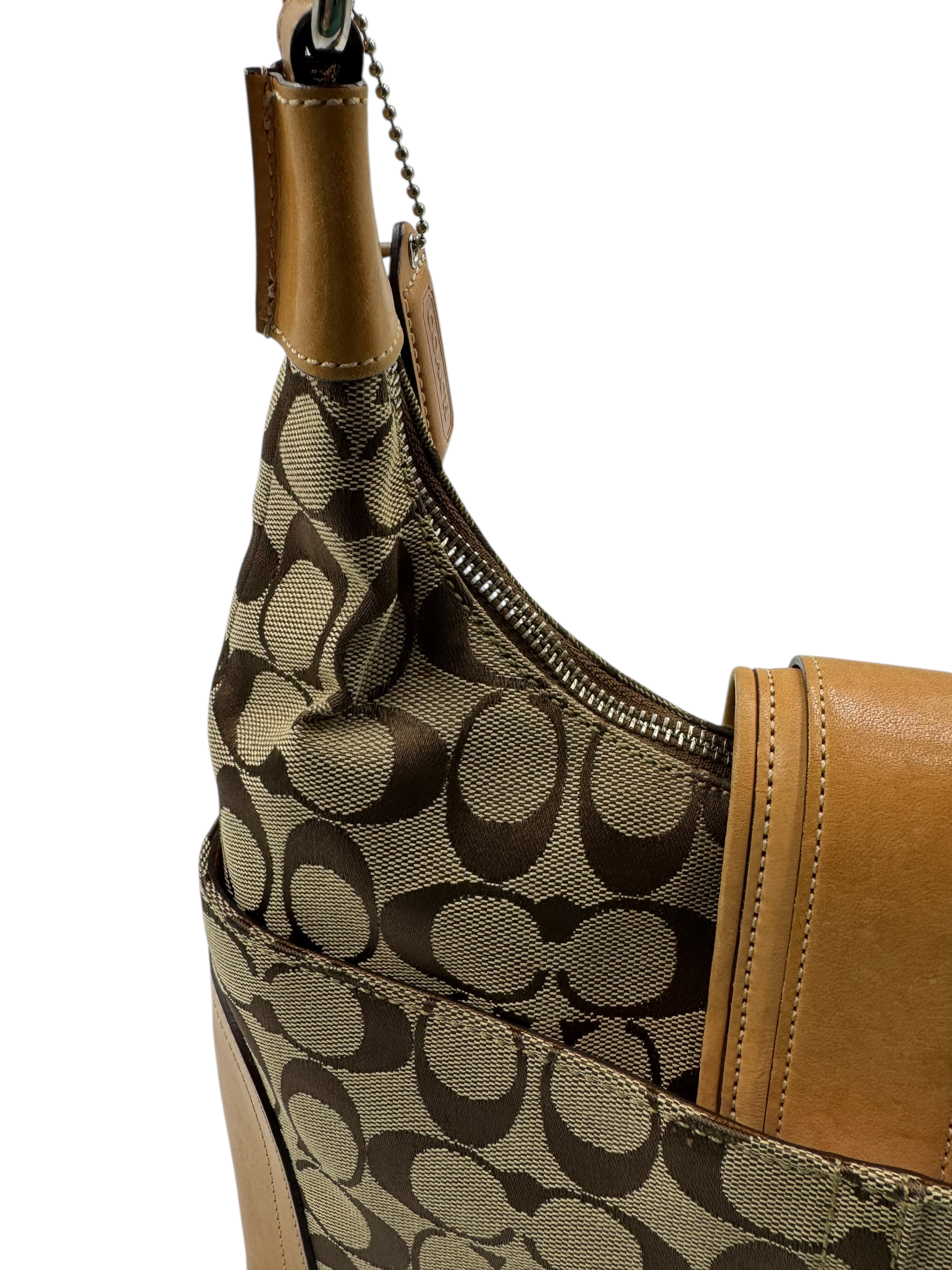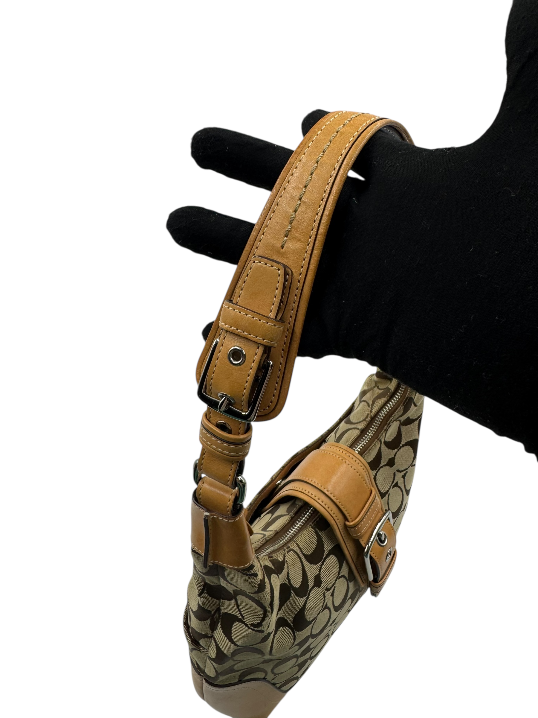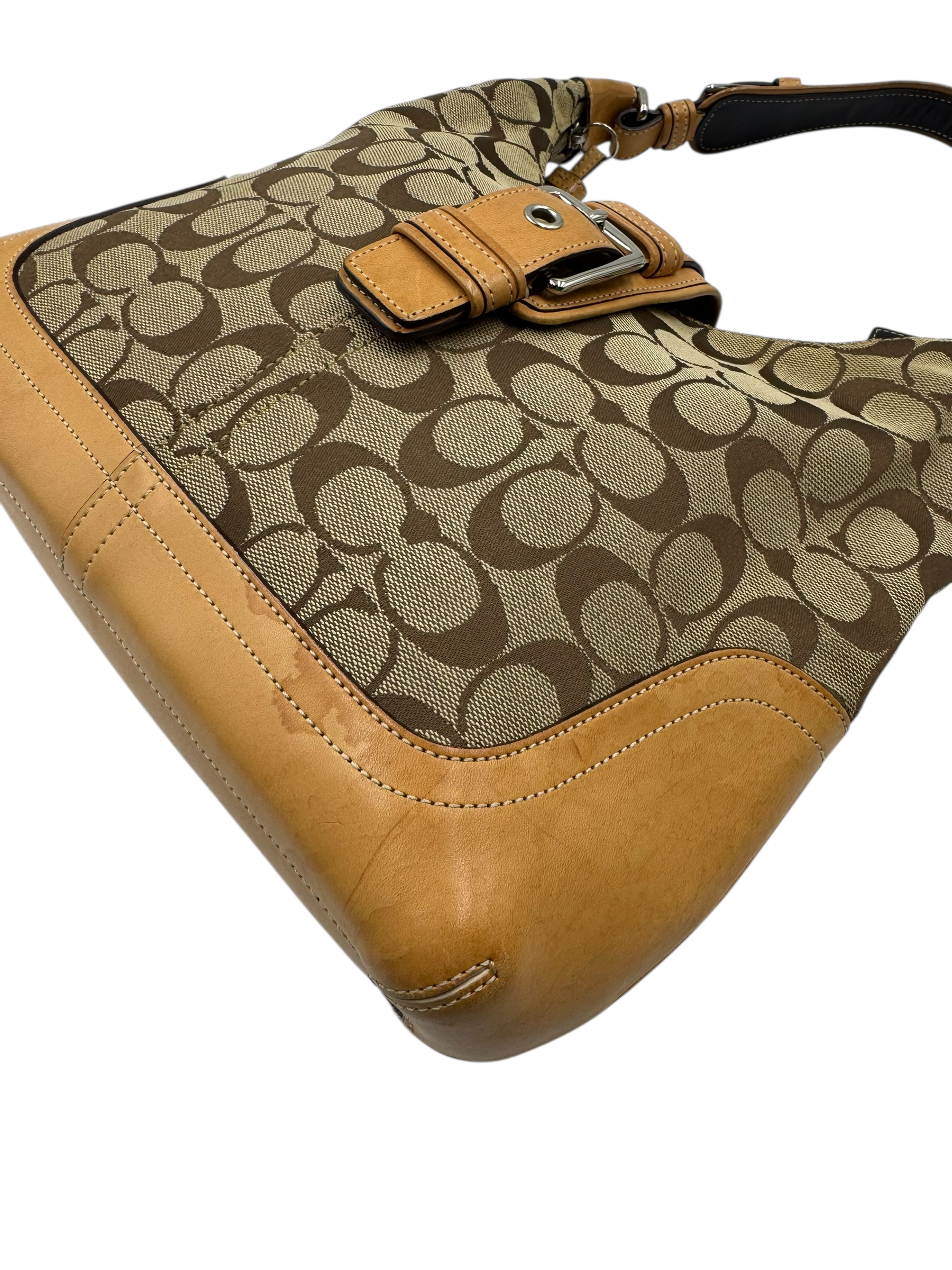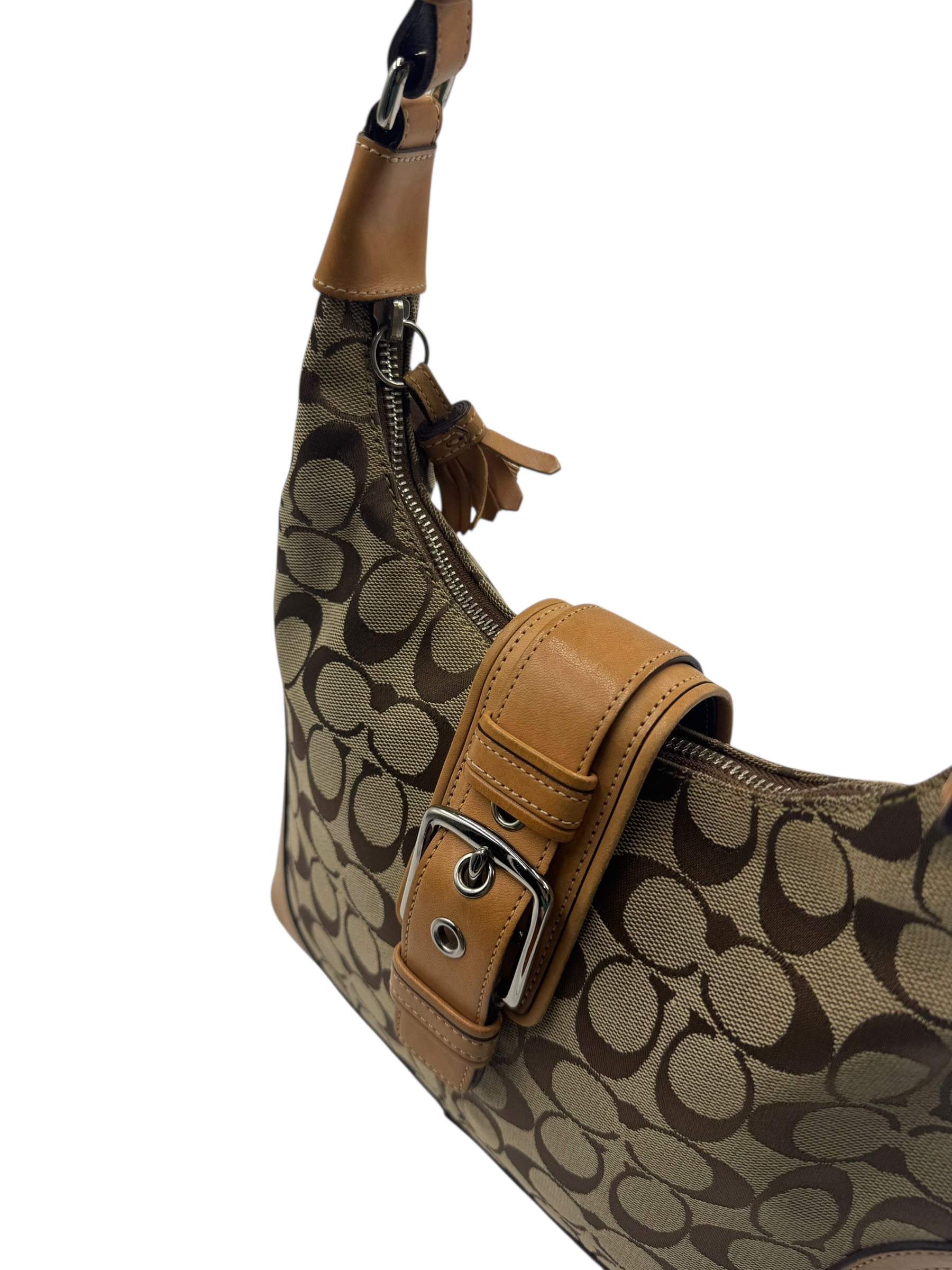Classic Coach Signature monogram canvas with tan leather trim and silver-tone hardware. Features front buckle detail, top zip closure, and adjustable shoulder strap.