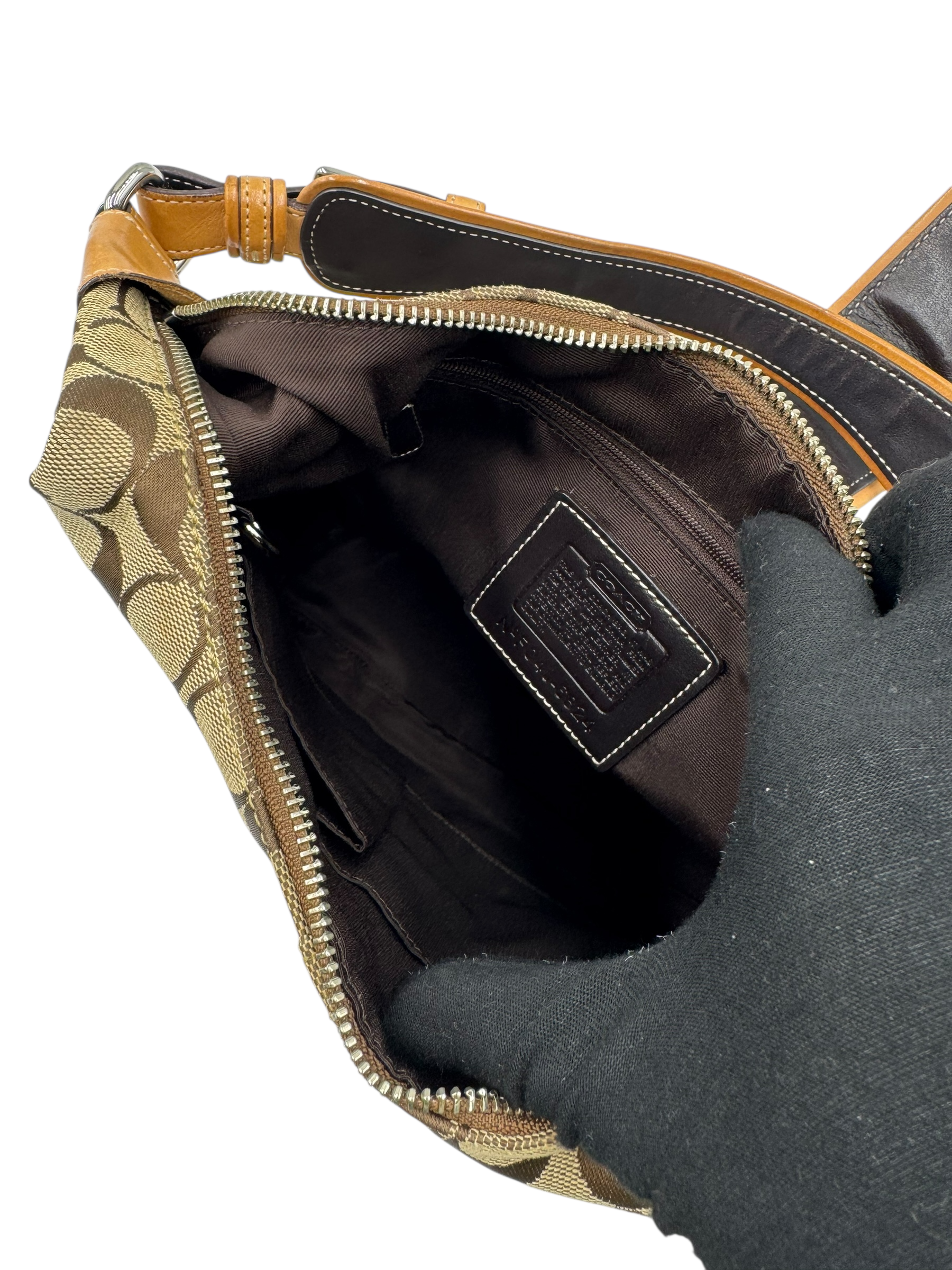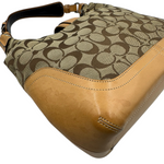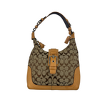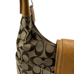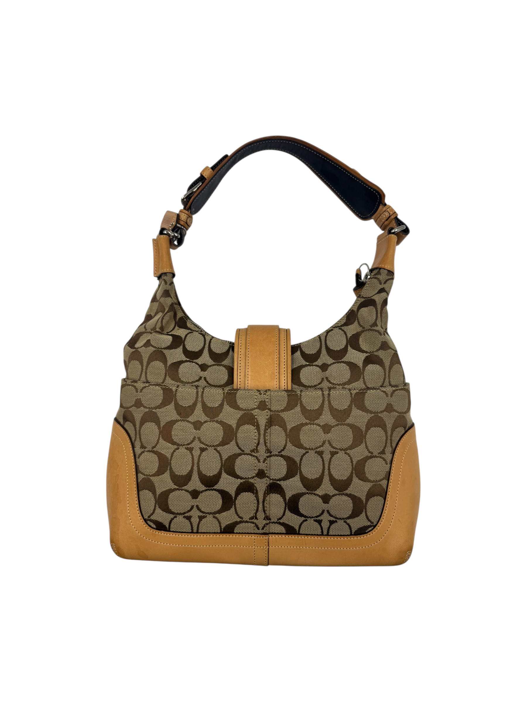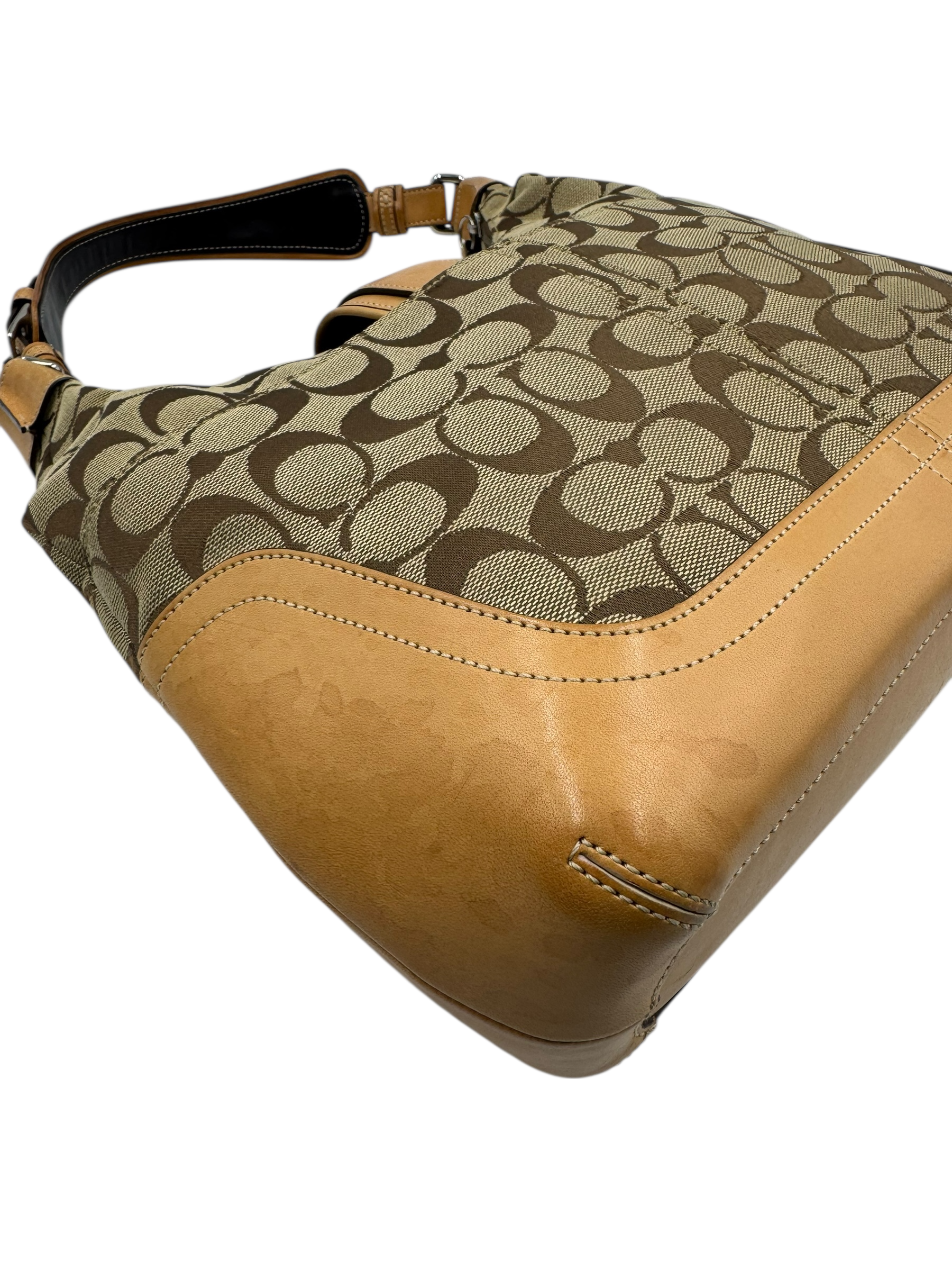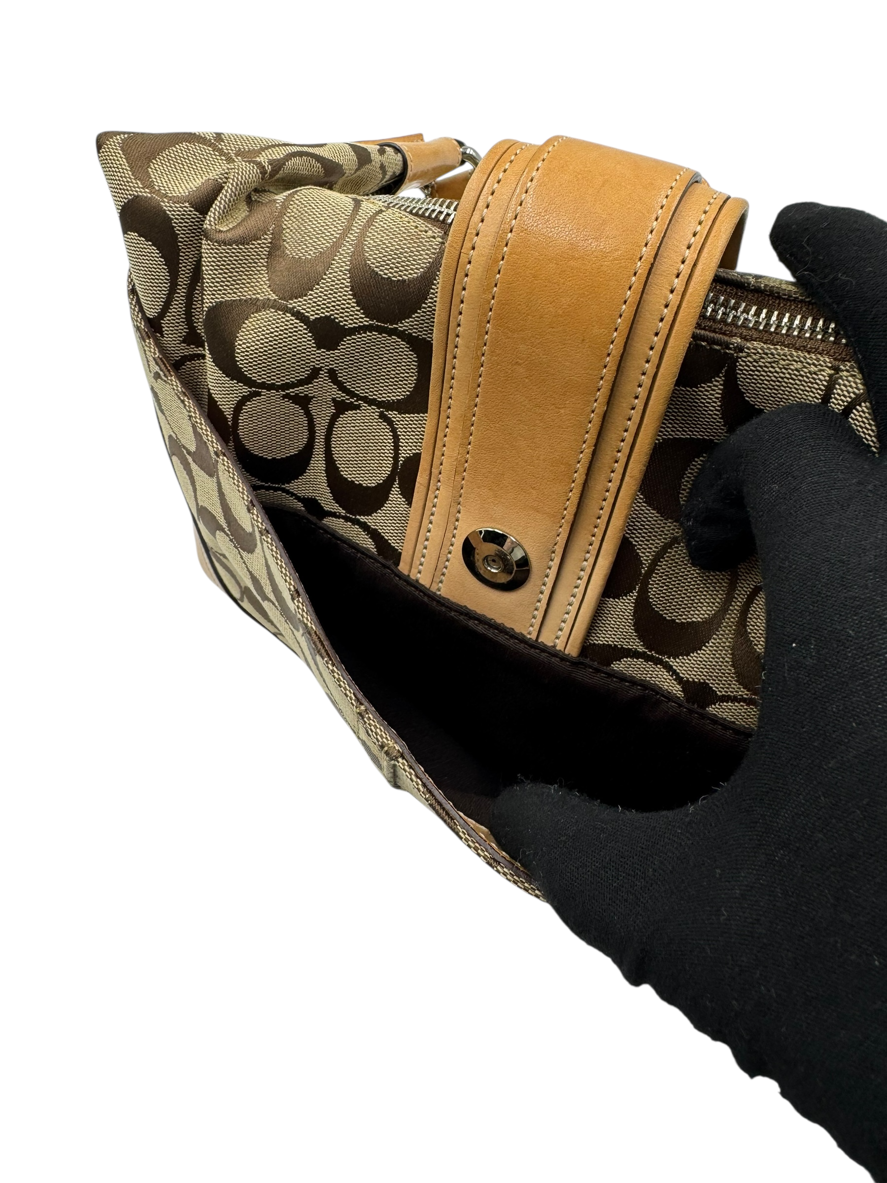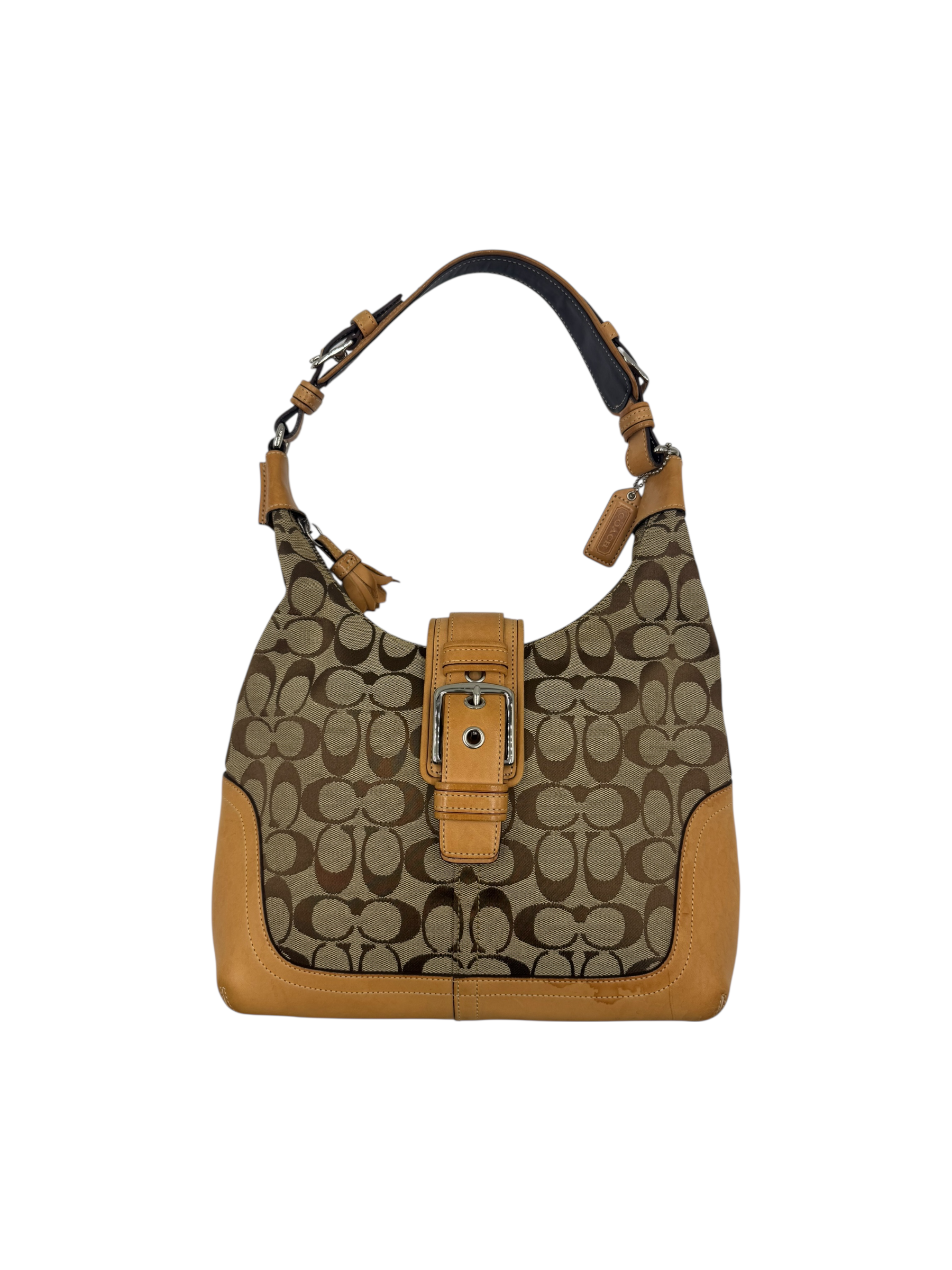 Classic Coach Signature monogram canvas with tan leather trim and silver-tone hardware. Features front buckle detail, top zip closure, and adjustable shoulder strap.