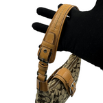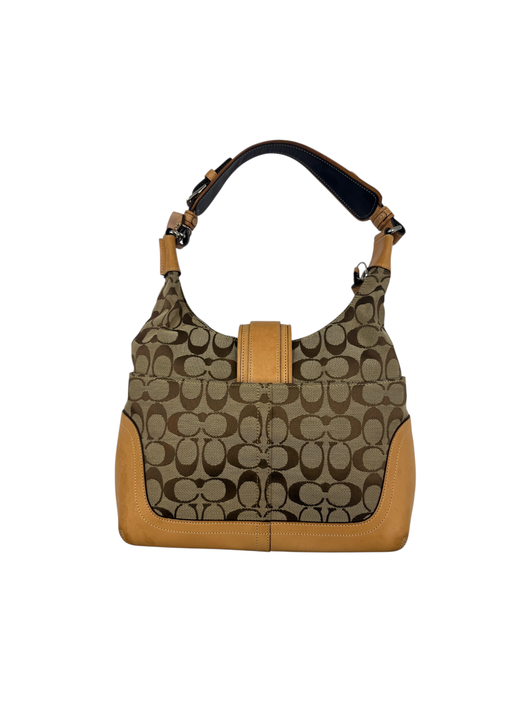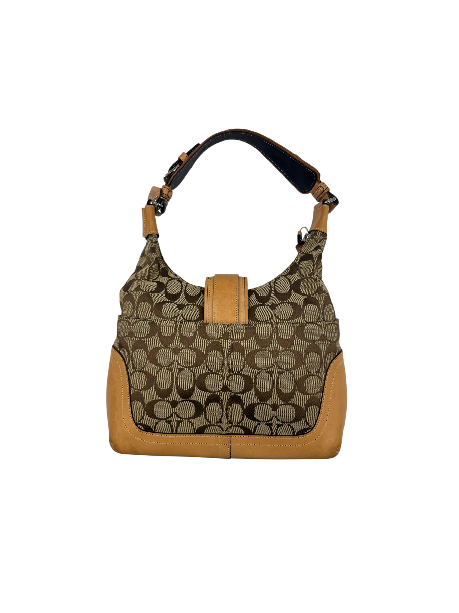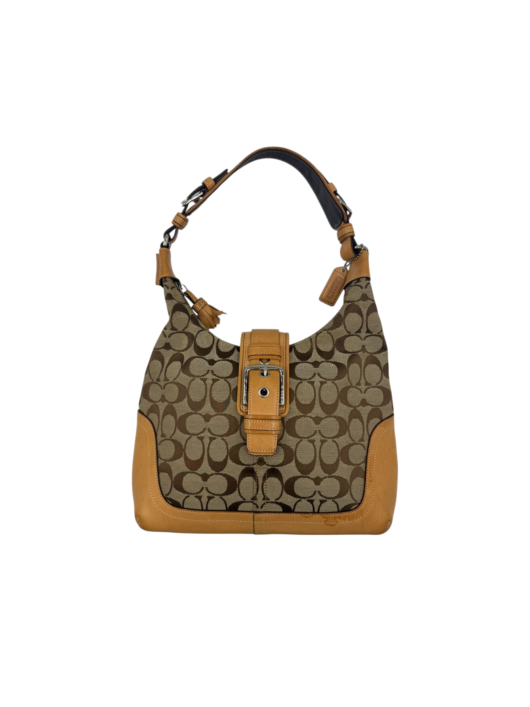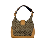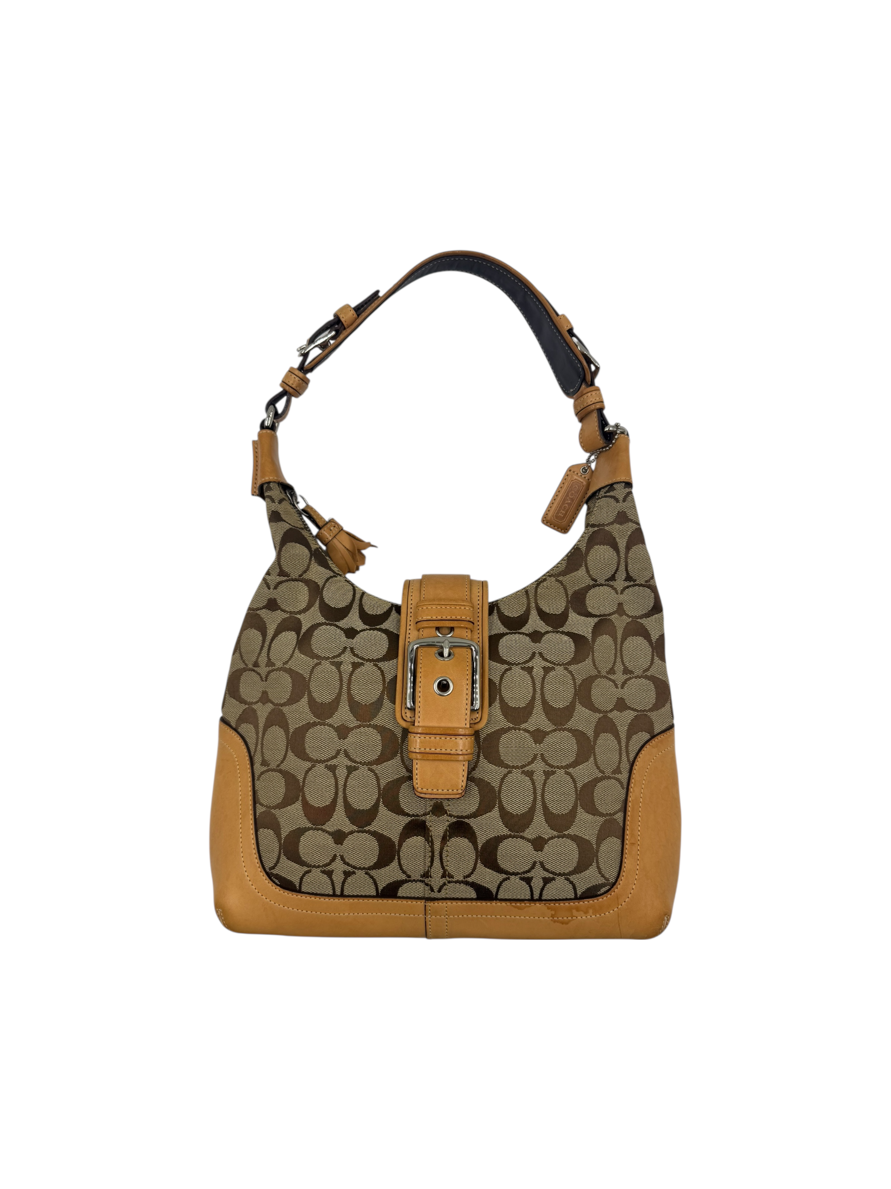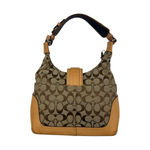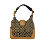 Classic Coach Signature monogram canvas with tan leather trim and silver-tone hardware. Features front buckle detail, top zip closure, and adjustable shoulder strap.