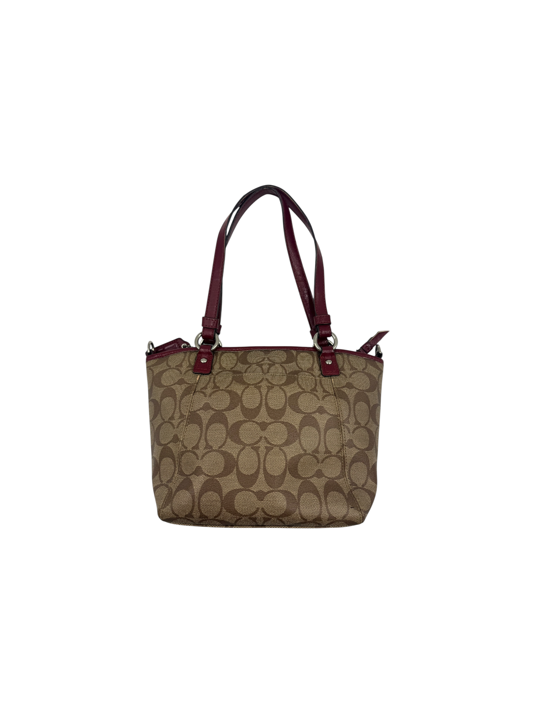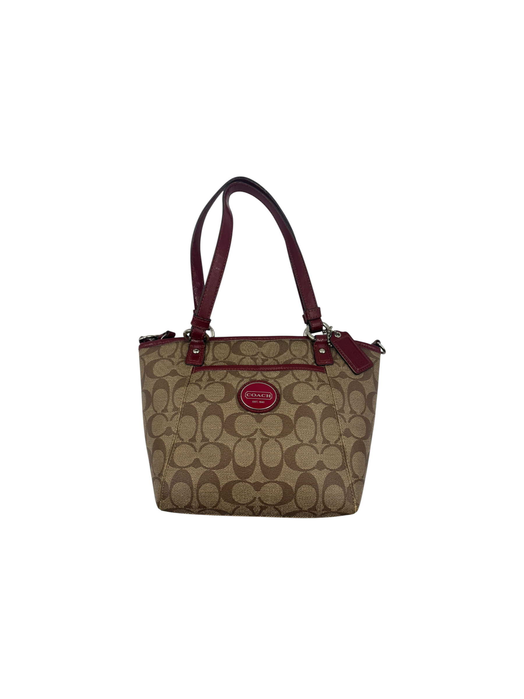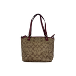 Classic Coach mini tote crafted from signature jacquard canvas with burgundy patent leather trim. Features dual top handles and a detachable matching shoulder strap for versatile wear. Accented with silver-tone hardware and signature Coach hang tag. A timeless and practical piece that transitions effortlessly from day to night.