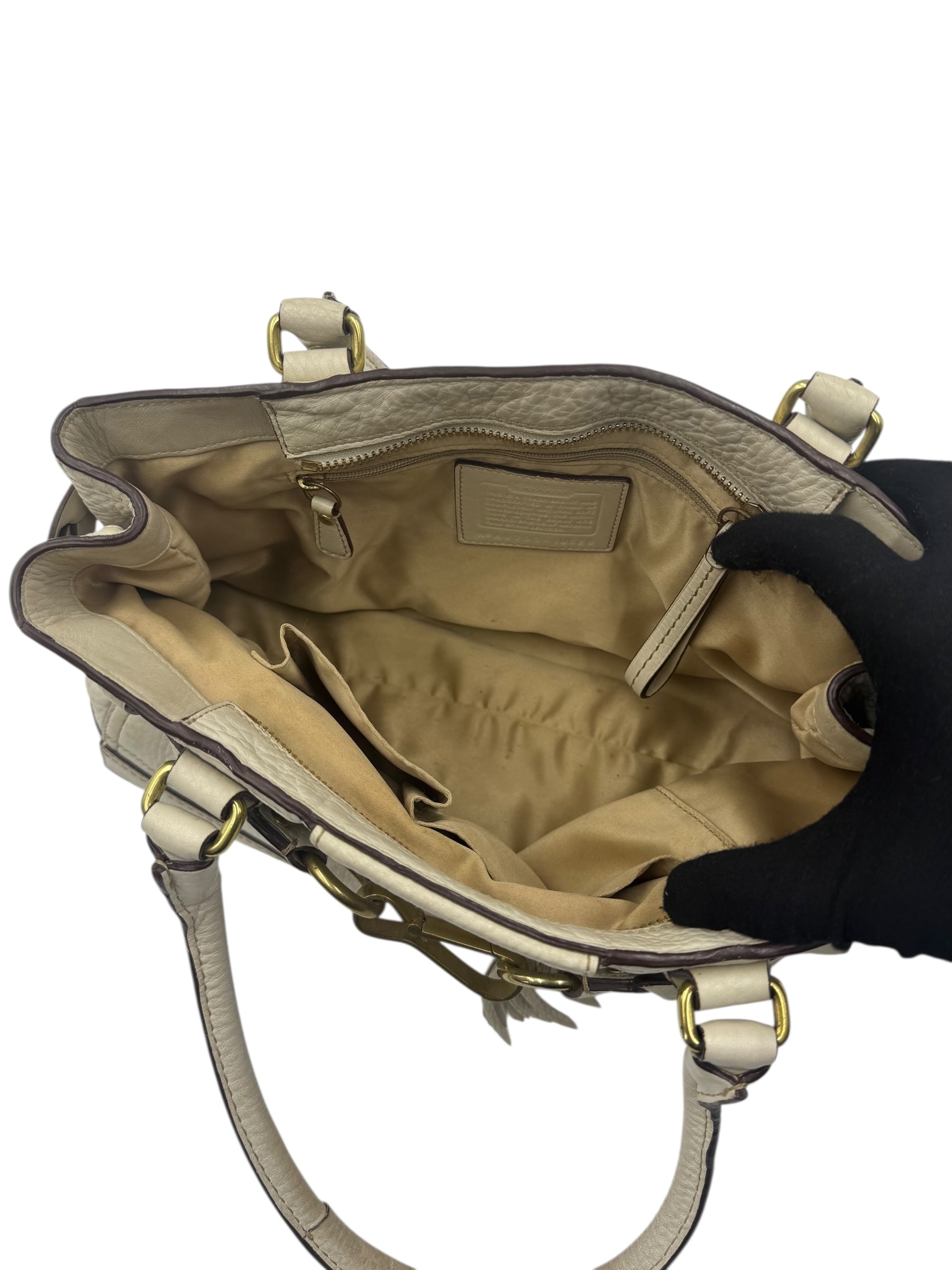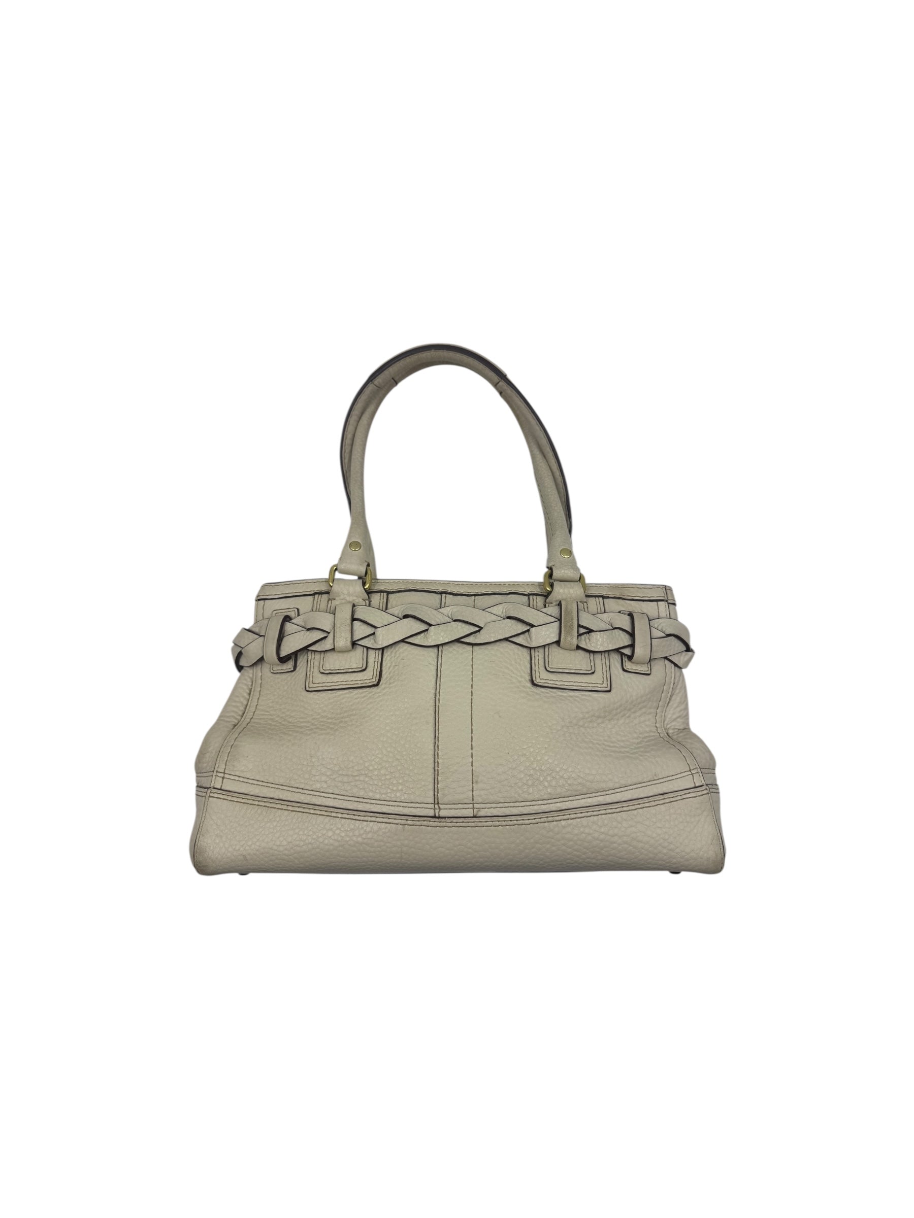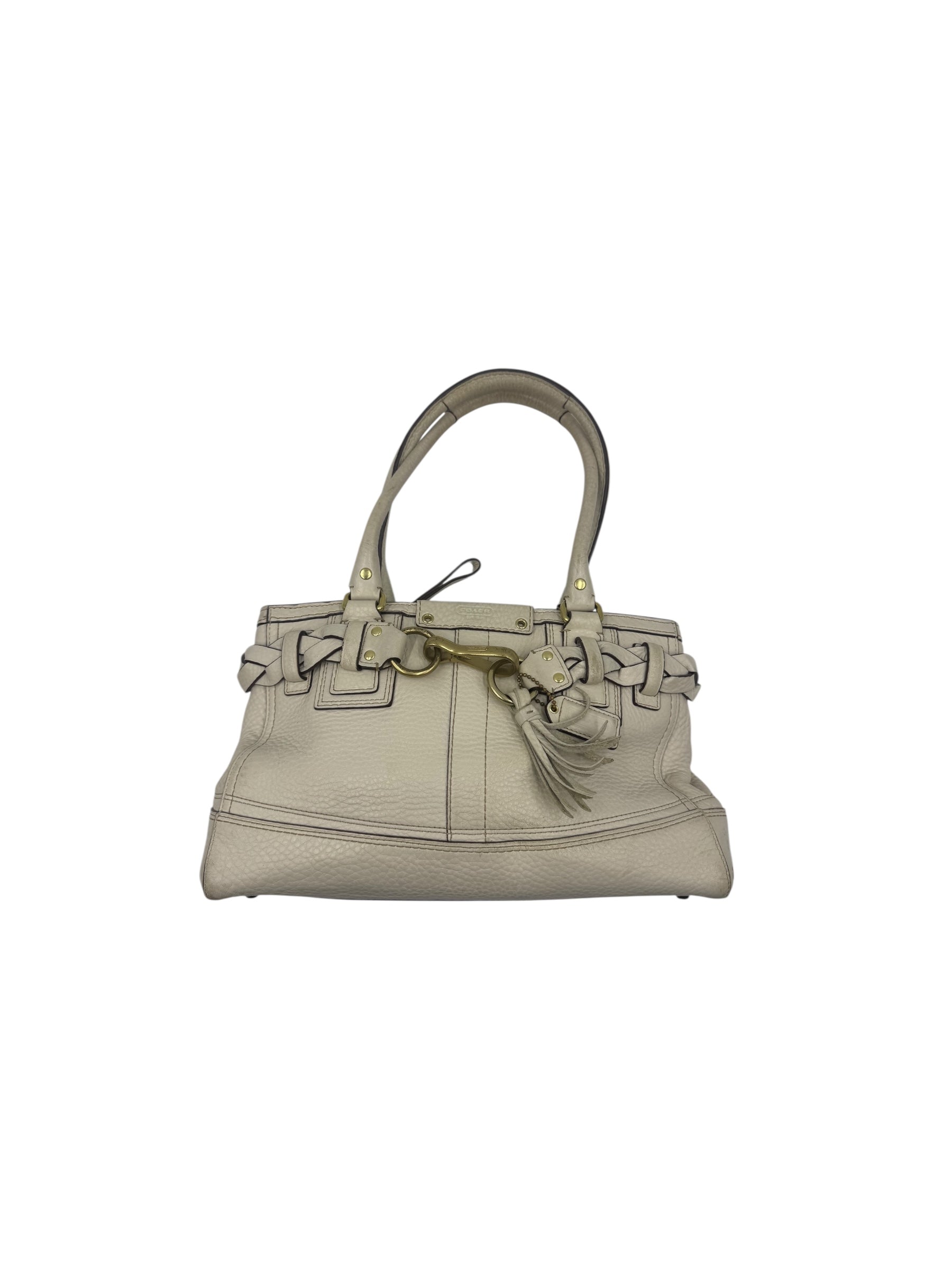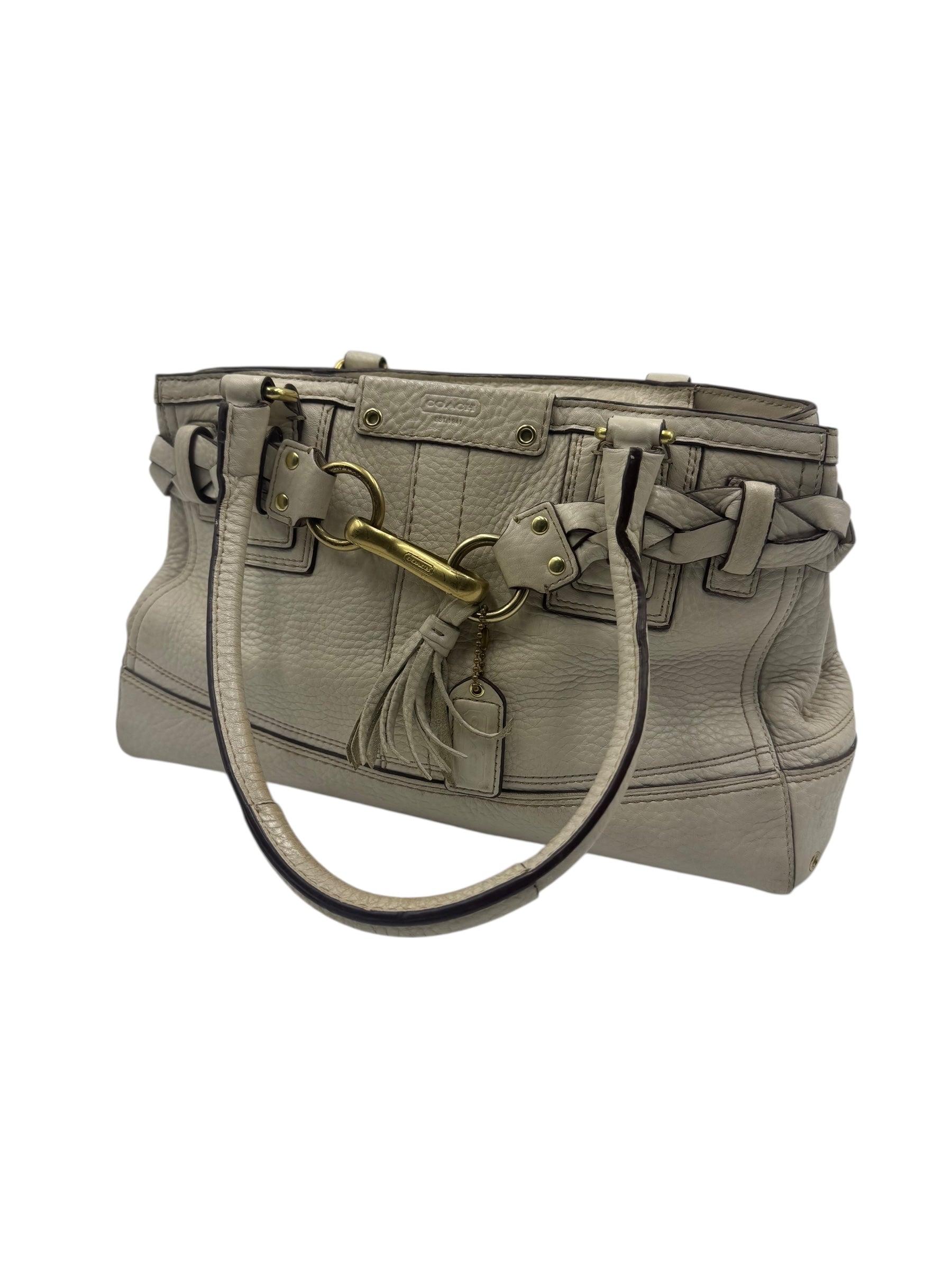 Classic Coach white pebbled-leather shoulder bag featuring braided leather detailing, gold-tone hardware, front clip closure, and matching tassel charm.