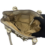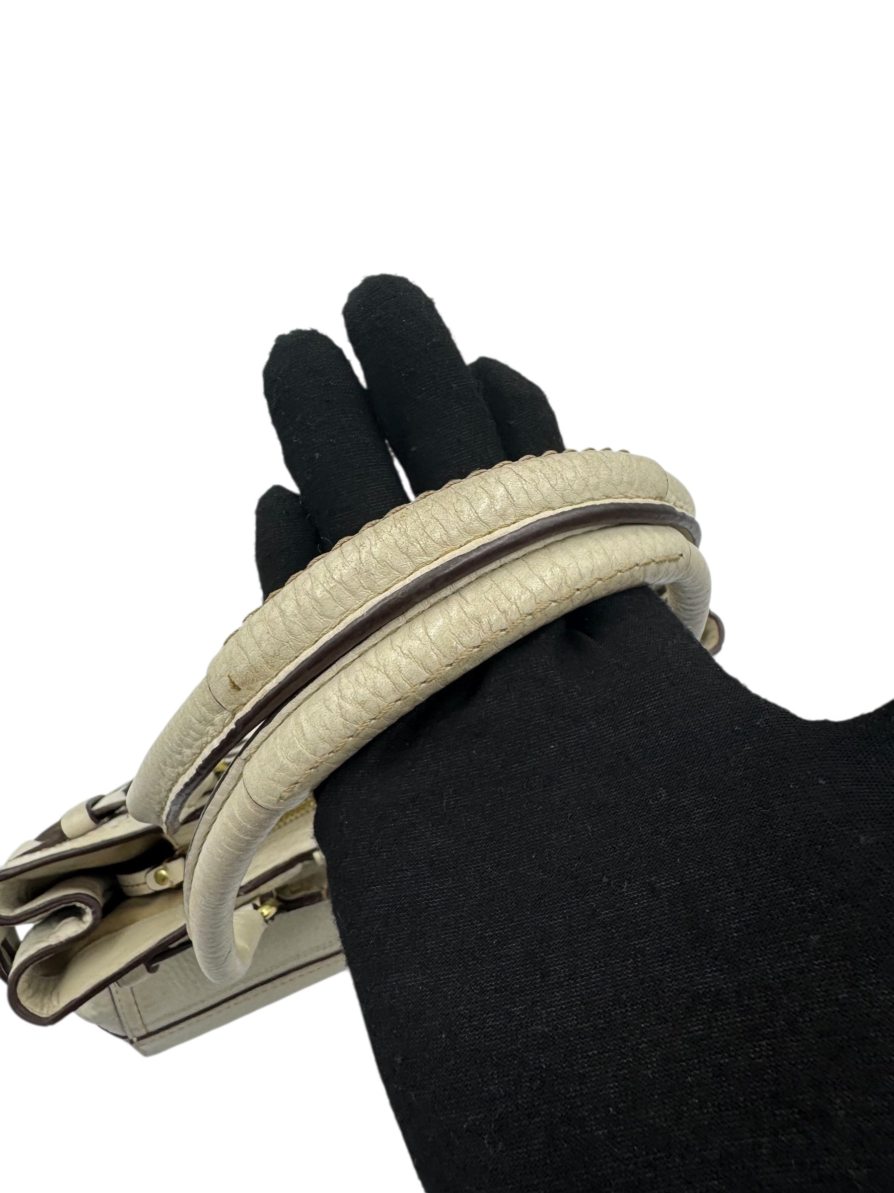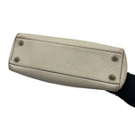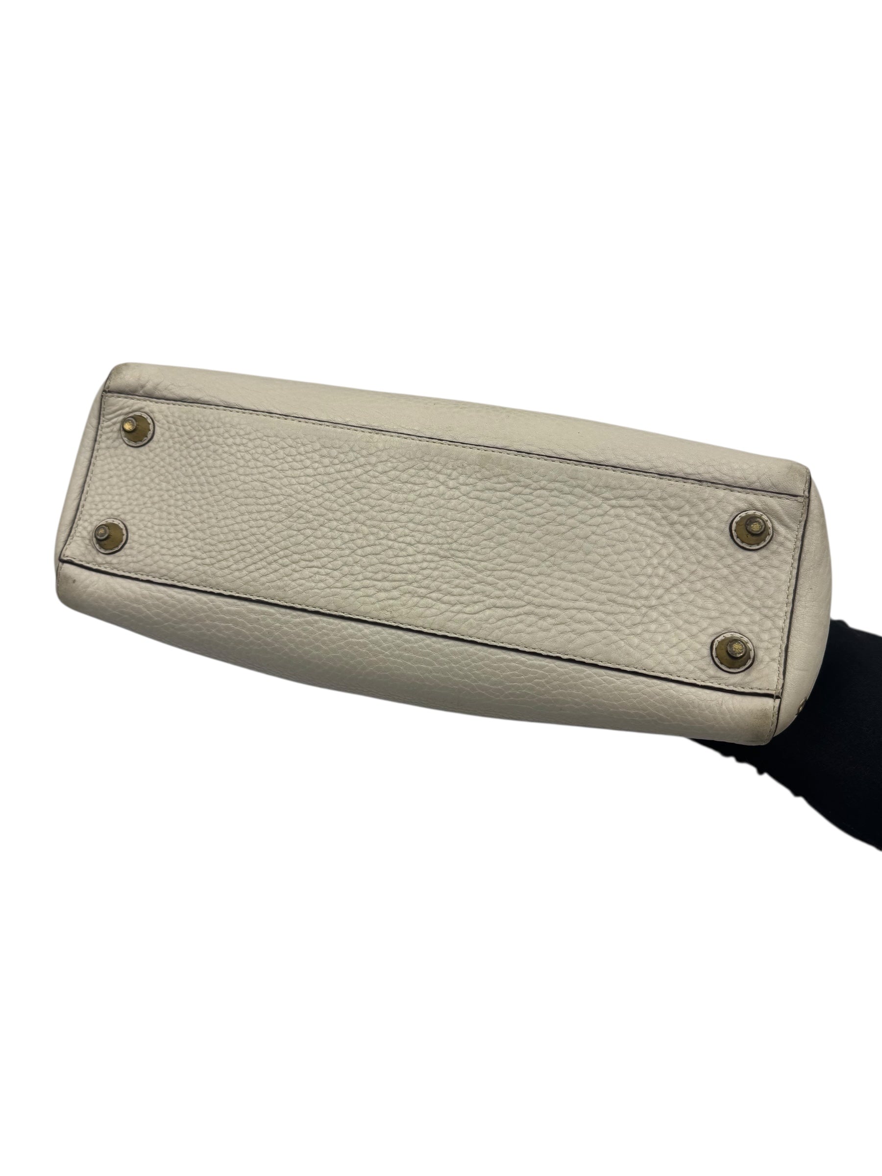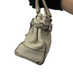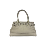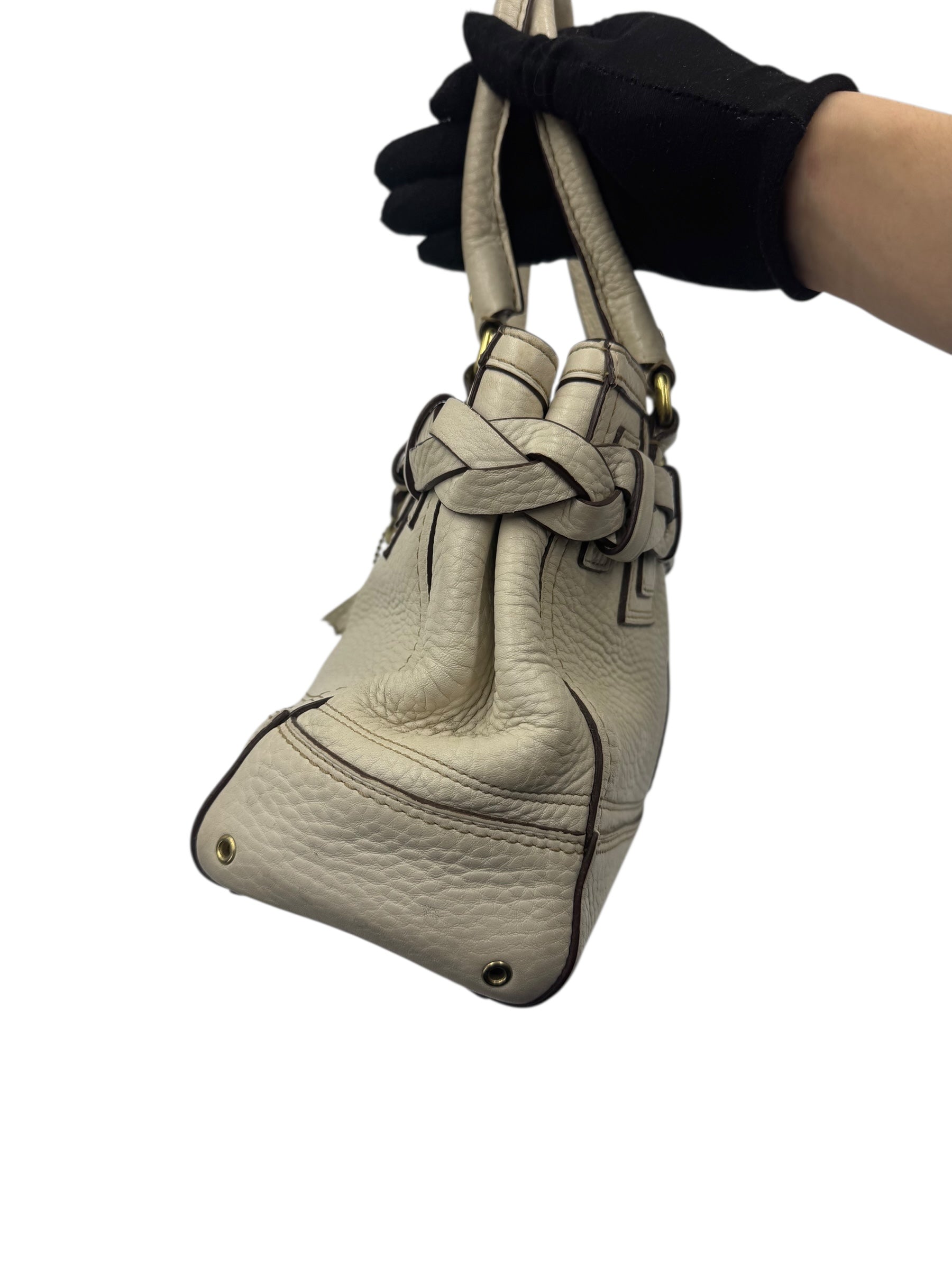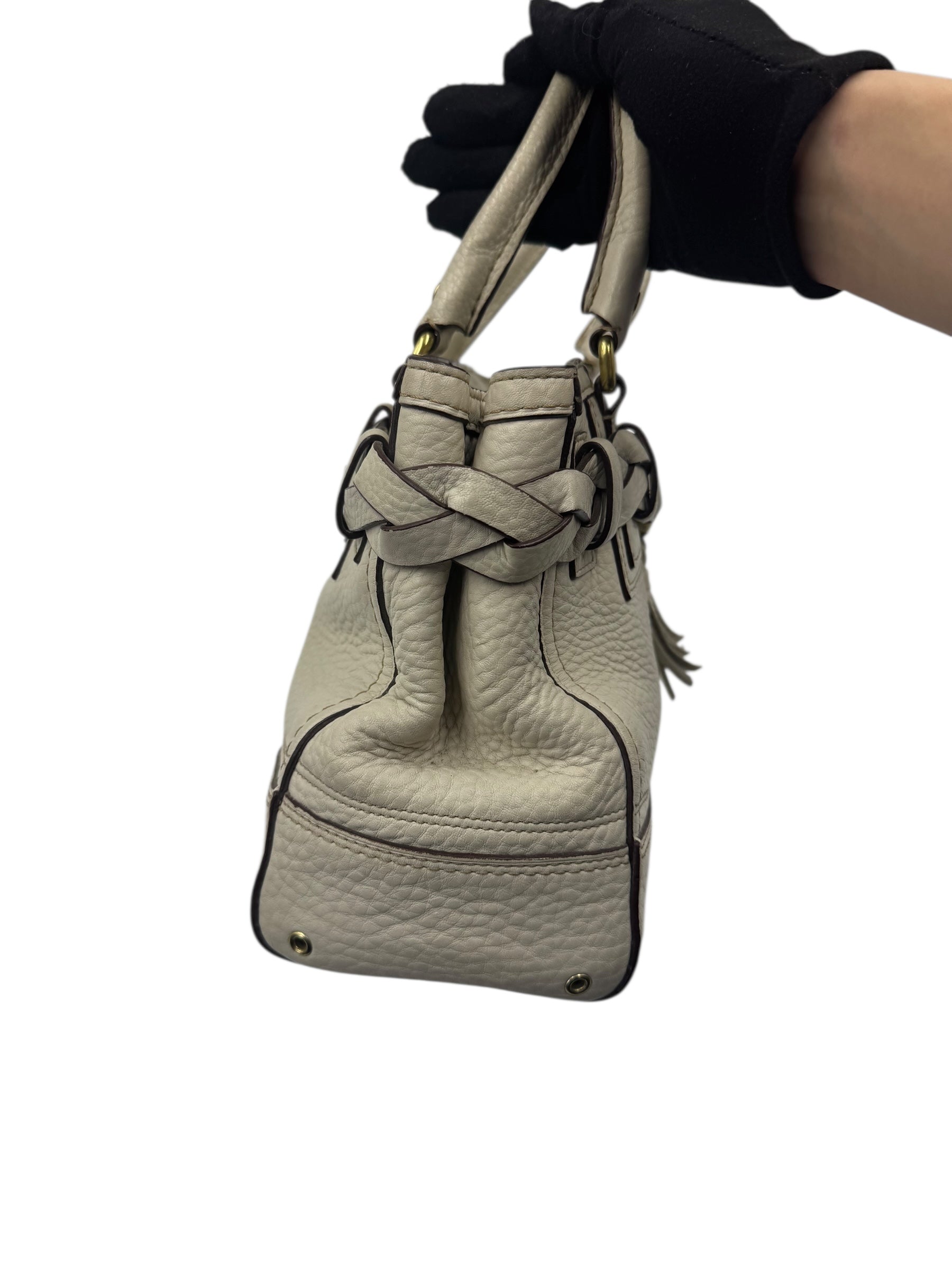 Classic Coach white pebbled-leather shoulder bag featuring braided leather detailing, gold-tone hardware, front clip closure, and matching tassel charm.